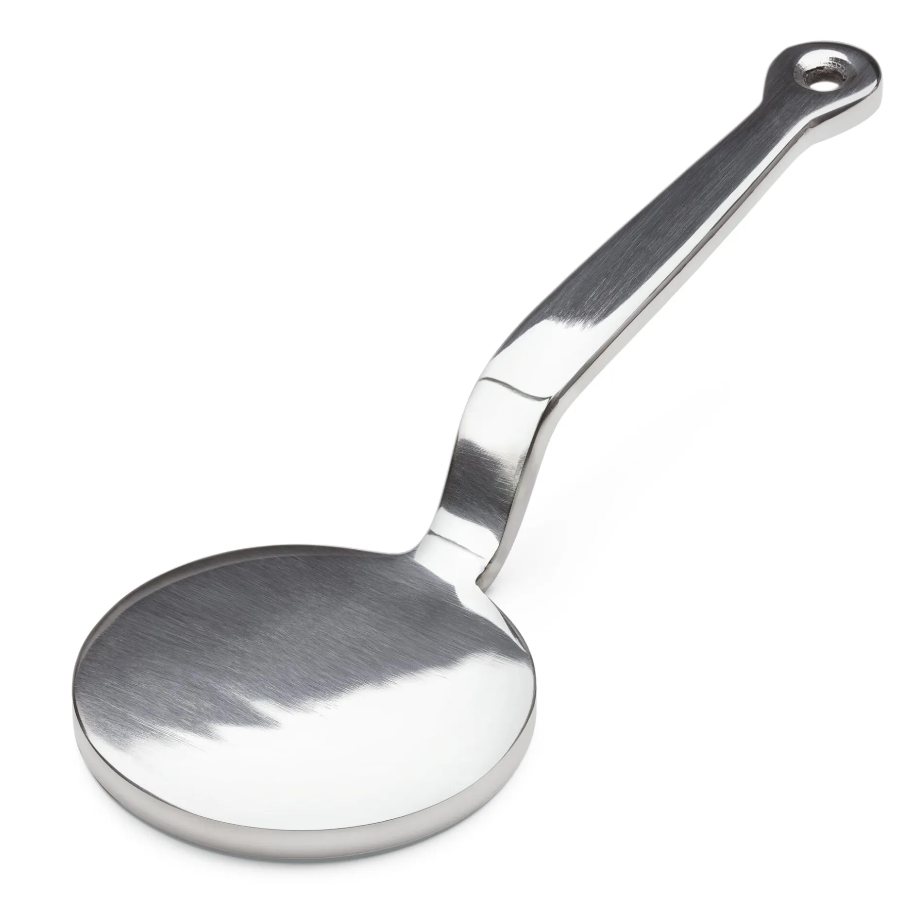Ein Fleischklopfer, zum Bereiten von Carpaccio, Saltimbocca und ähnlichen Spezialitäten, denen er mit einem Gewicht von 1 kg mehr als gerecht wird. Die kreisrunde Klopffläche hat einen Vorteil: Sie verkantet beim Kontakt mit dem rohen Fleisch weniger als eine rechteckige Fläche; so wird das Fleisch gleichmäßig dünn und zart. Mit dem Preis bezahlen Sie aber nicht die verblüffend schlichte Schönheit dieses geschmiedeten Küchenwerkzeugs, sondern lediglich die Fülle des verwendeten Materials (Edelstahl), dessen Verarbeitung und die Glanzpolitur der spiegelnden und damit hygienischen Oberfläche. Das schwere Gerät wird in der Lombardei gefertigt.