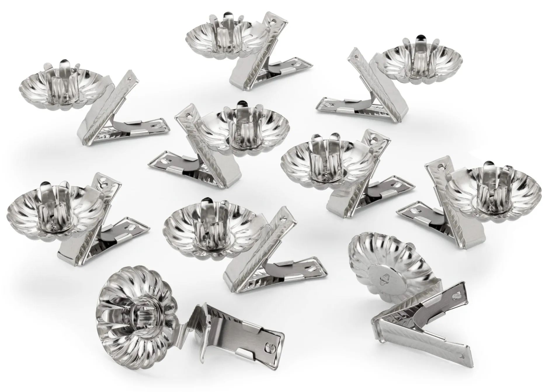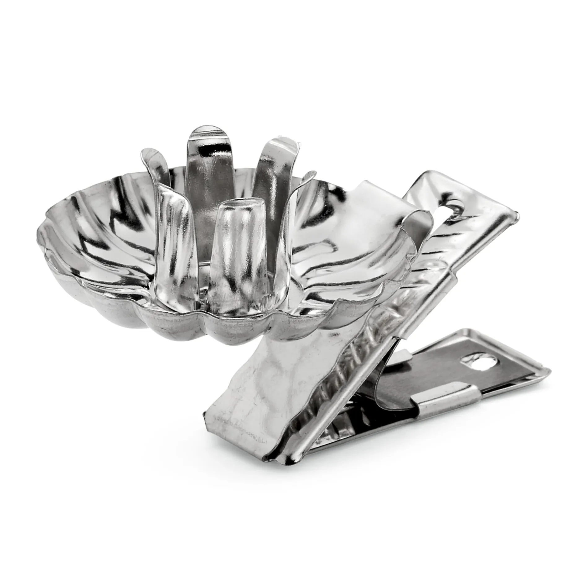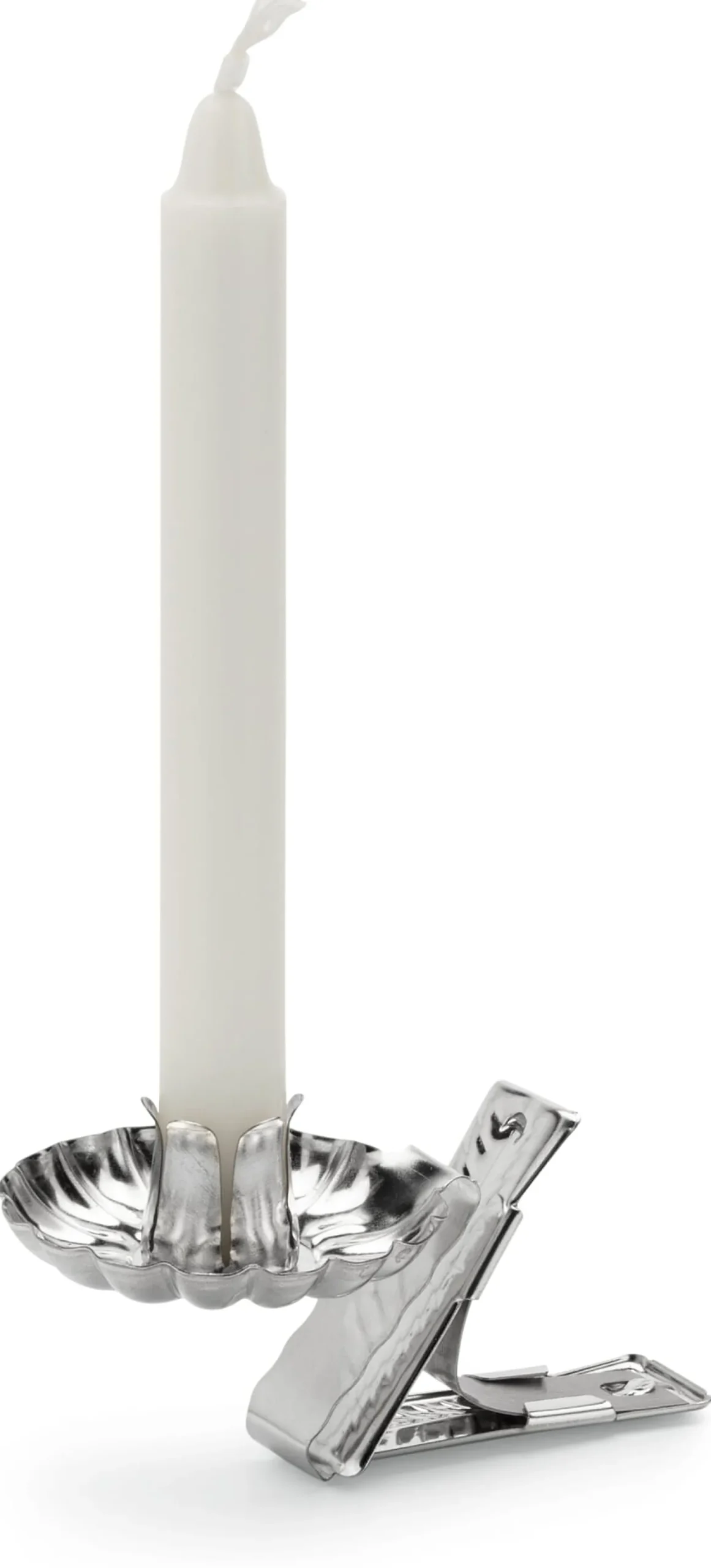 Für Kerzen mit 1–1,5 cm Ø. Halter Stahlblech, Feder Stahl. Wachsteller Ø 4 cm. Länge 7 cm. Gewicht 10 g.