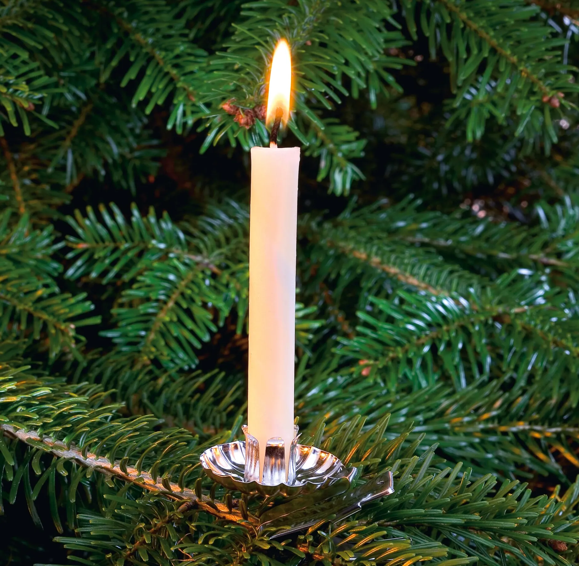 Klemmhalter mit Blattfeder bieten – gegenüber solchen mit Spiralfedern – eine bessere Fixierung der Feder am Halter und einen sehr sicheren Halt am Baum. Dieser Baumkerzenhalter ist vollständig aus Stahlblech gefertigt: Das robuste Material ist so stabil, dass der Kerzenhalter die Baumkerzen sicher fixiert, und zugleich flexibel genug, um den Halter der Neigung eines natürlich gewachsenen Astes anzupassen. Die Blattfeder besteht aus hochfestem Stahl, der sich konstruktionsbedingt nicht überdehnen lässt. Nicht zuletzt verhindert der Wachsteller unterhalb des Kerzenhalters die Verschmutzung von Dekoration, Baum und Boden durch eventuell herabtropfendes Kerzenwachs.