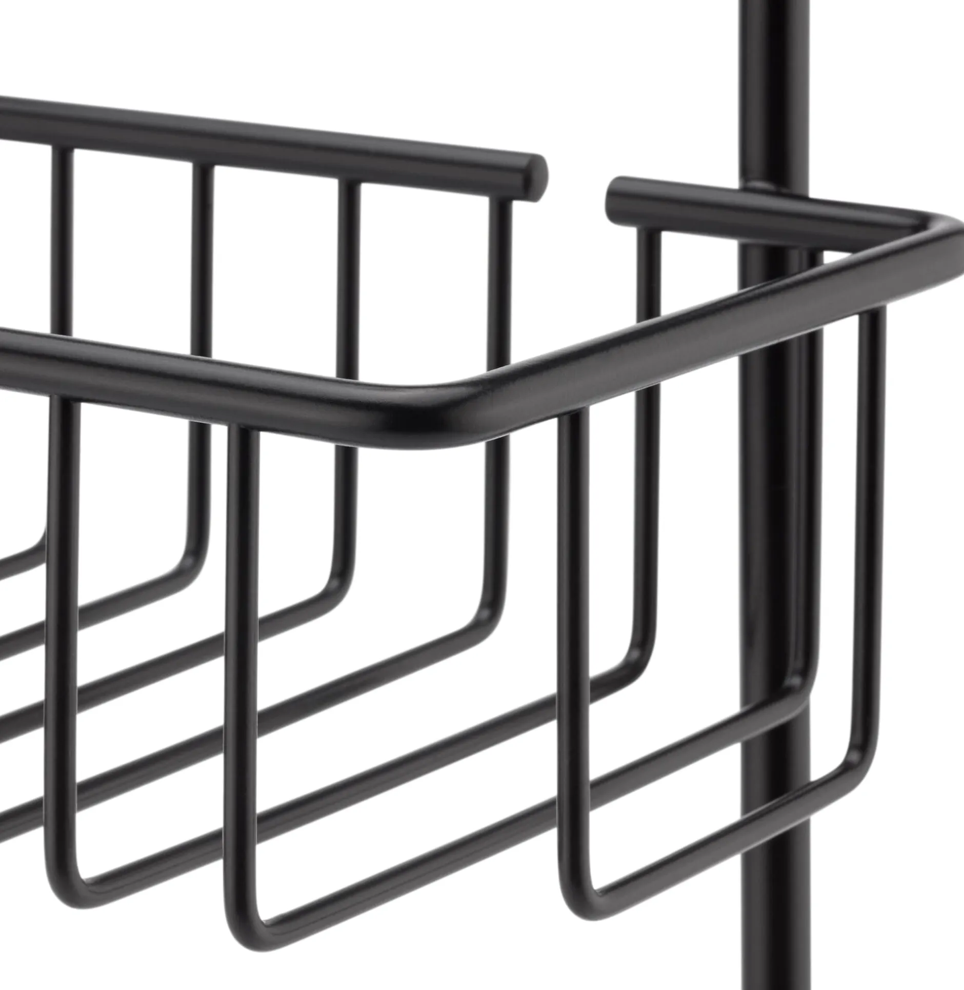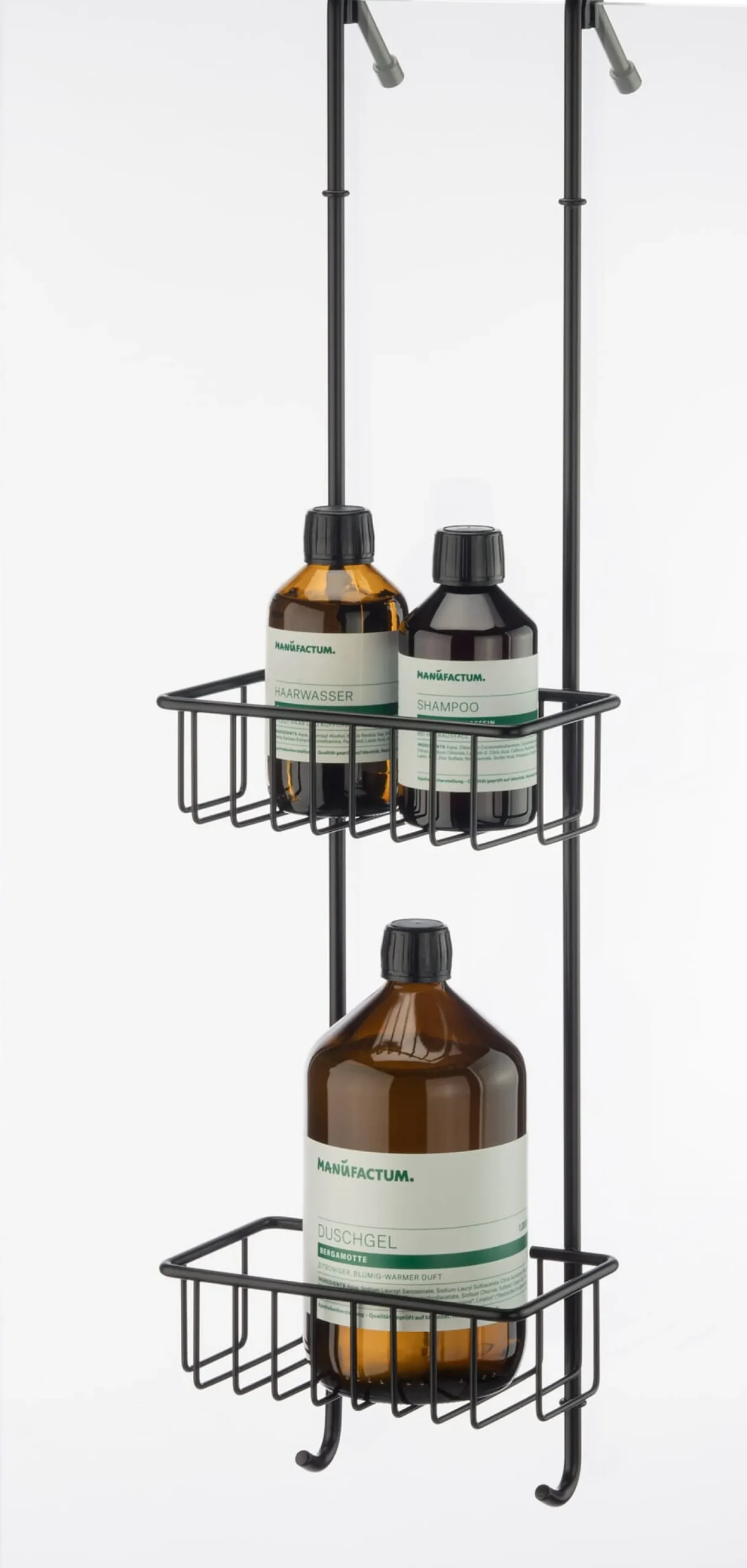 Zur Aufbewahrung von Pflegeprodukten in der Dusche. Zwei Haken nehmen zudem Waschlappen, Sisalsäckchen und Badeschwamm oder den Abzieher für Fliesen und Glaswand auf. Die Duschablage wird einfach an die Duschwand gehängt. Zum Schutz derselben wird unter die Messingbügel ein Glaskantenschutz aus Polyamid gesteckt (beiliegend für Glasstärken von 6 und 8 mm).
