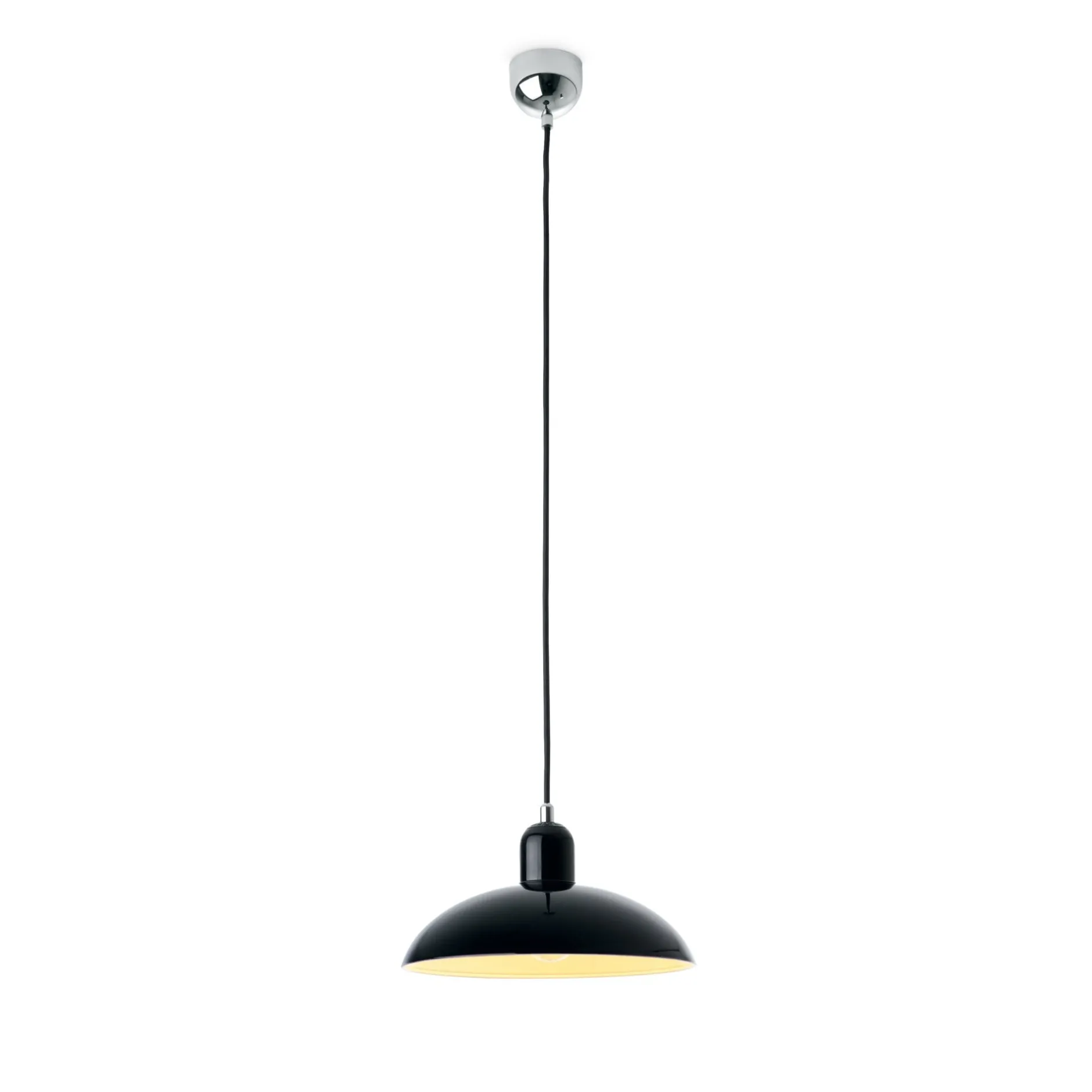 Schirm aus nasslackiertem Stahl, innen weiß lackiert, Ø 28,5 cm, Höhe 14,5 cm. Baldachin aus Stahl, glänzend verchromt. Das schwarze Textilkabel (Länge 2,8 m) kann auf die gewünschte Länge gekürzt werden. Fassung E27 (max. 60 W). Gewicht 940 g.