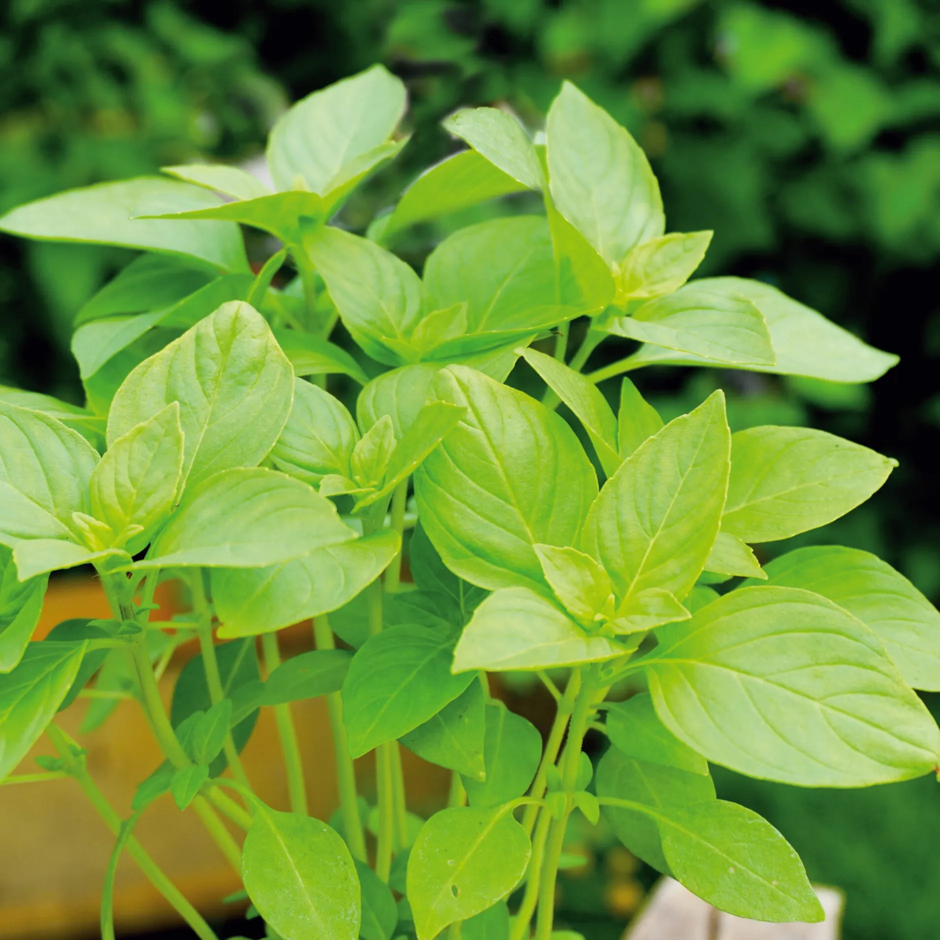 Die buschig wachsende Pflanze bildet viele kleine Blättchen mit dem typischen Basilikum-Aroma.