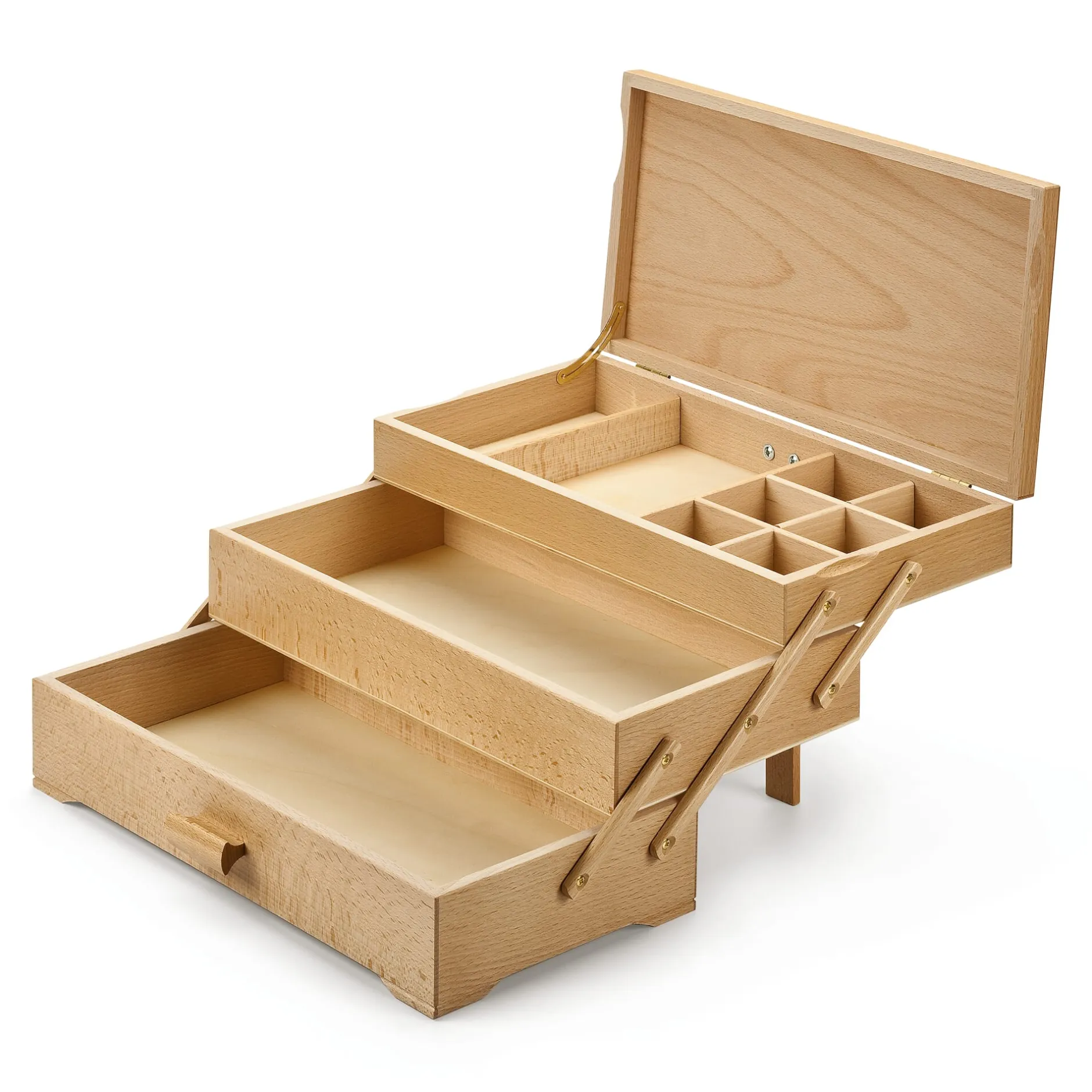 Buchenholz, außen lackiert. Obere Lade mit sechs kleinen und zwei größeren Fächern. Ein Stützfuß verhindert in aufgeklapptem Zustand das Kippen. Höhe 17 cm, Breite 35,5 cm, Tiefe 18 cm. Gewicht 1,6 kg. Lieferung ohne Dekoration.