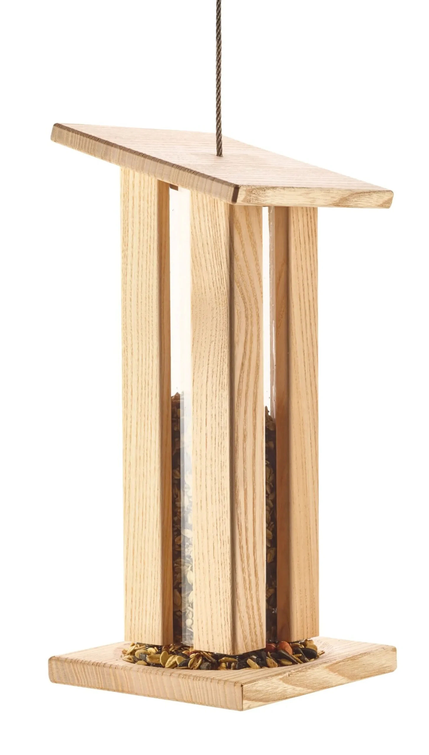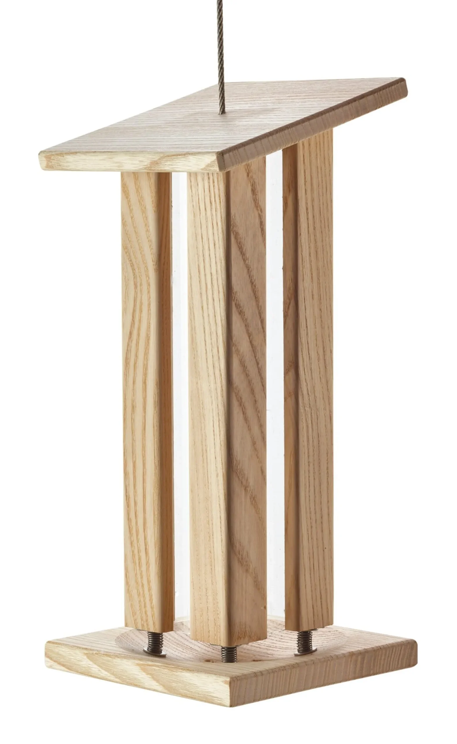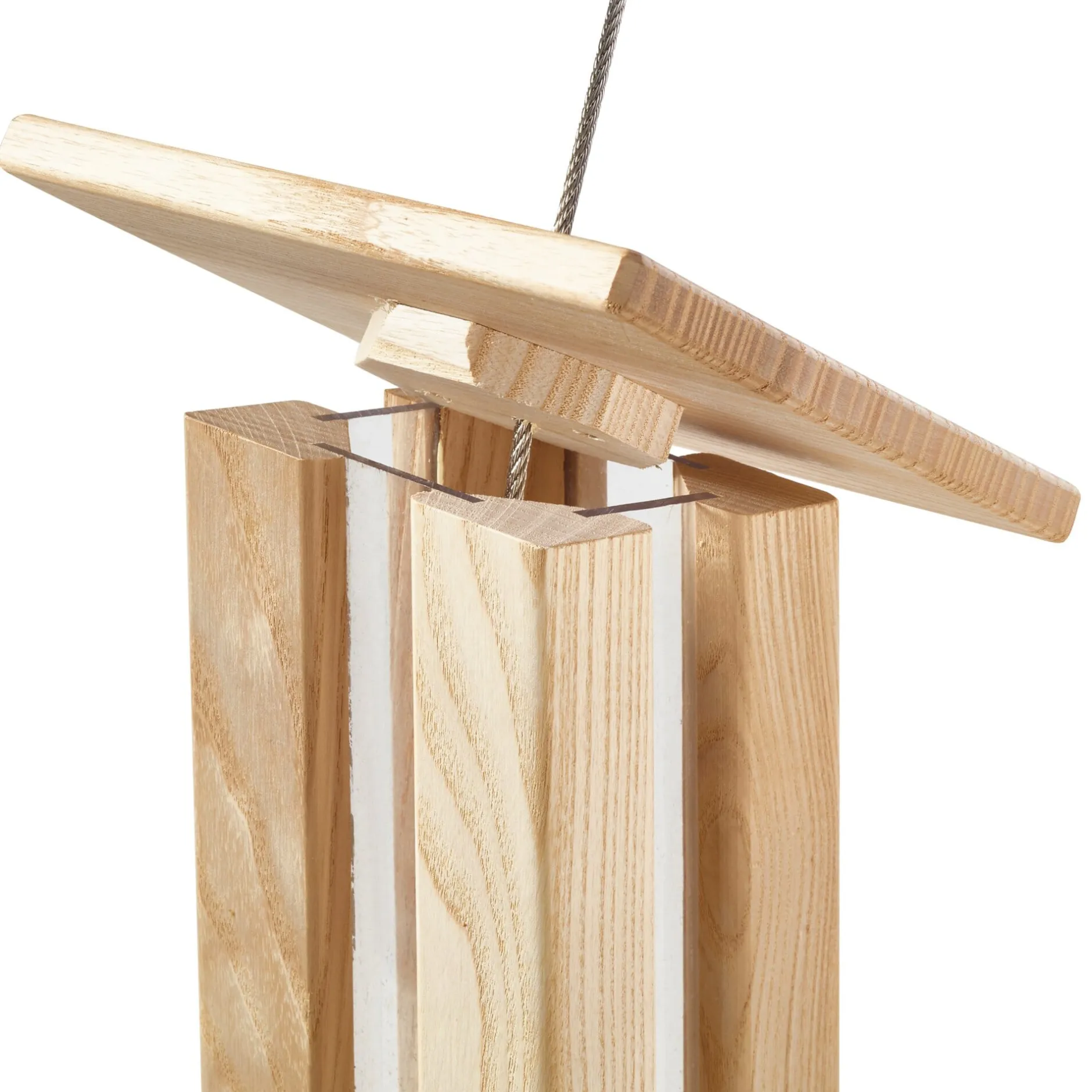 Bodenplatte mit Wasserabzugslöchern. Korpus aus Eschenholz, Futtersilo aus Plexiglas. Stabiles Aufhängeseil aus Edelstahldraht, mit Schlaufe.
