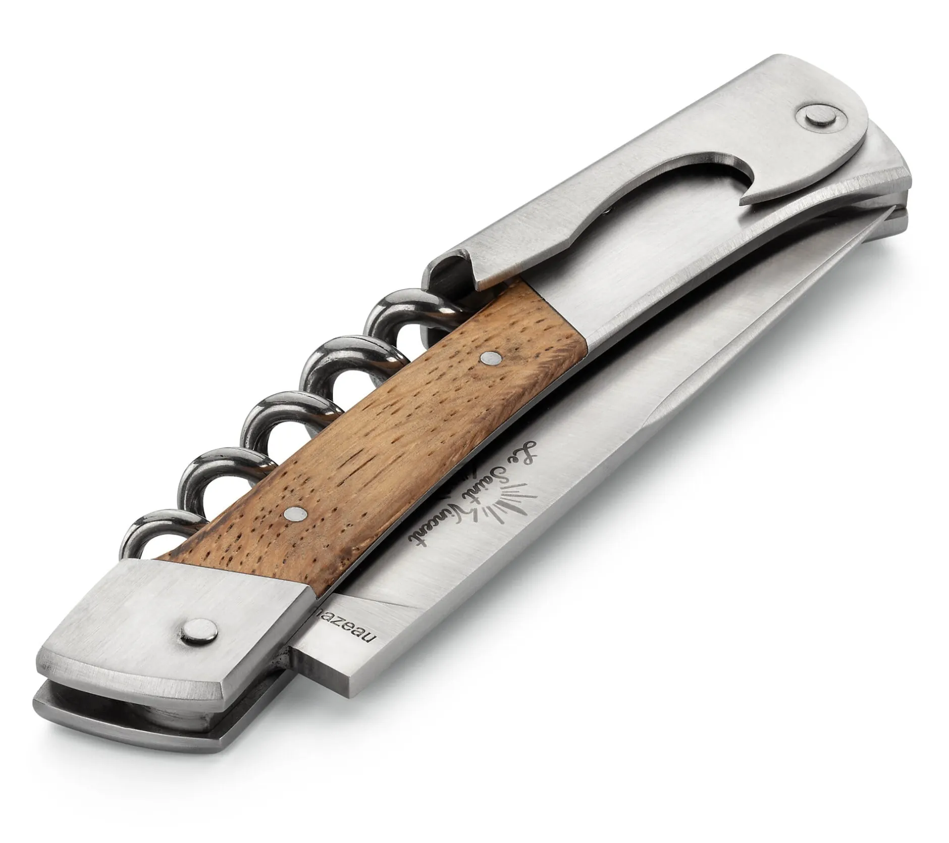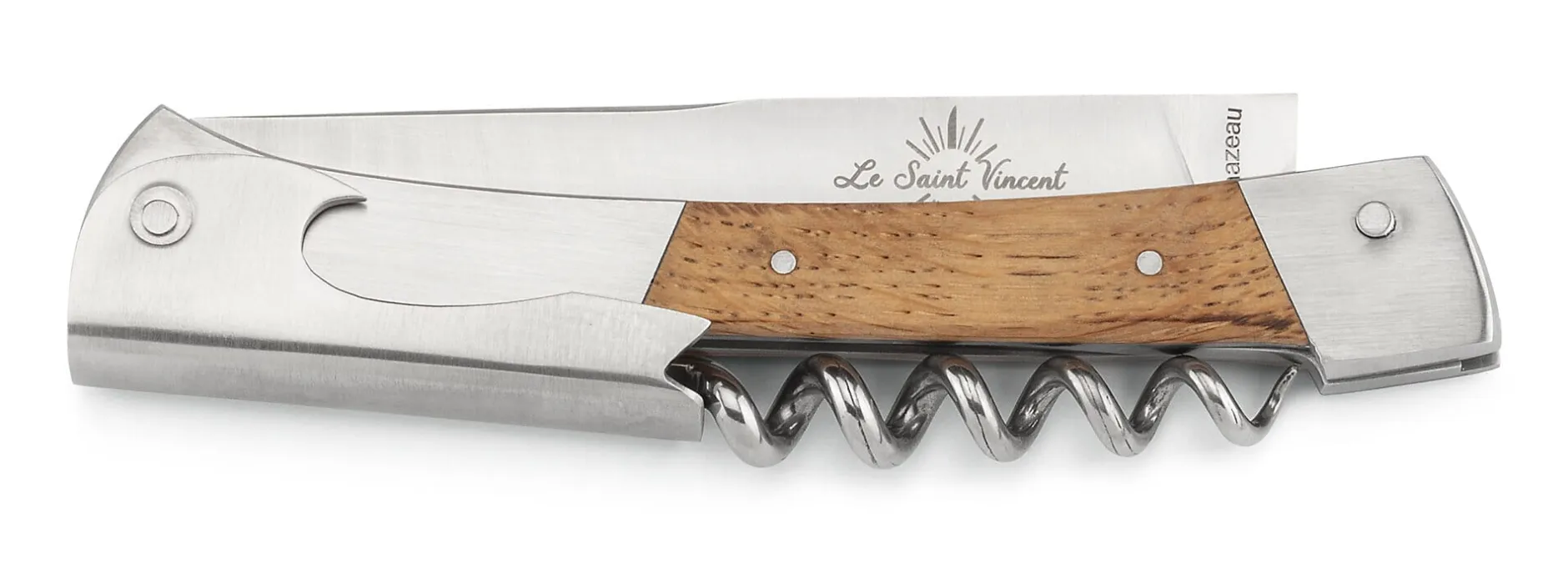 Der Heilige Vinzenz gilt den Franzosen als Schutzpatron ihrer Winzer, sein Namenstag im Januar wird im Burgund tradtionell sogar groß gefeiert. Was liegt da näher, als ein Sommeliermesser nach ihm zu benennen? Es kommt von den Besteckspezialisten bei Goyon Chazeau im Messerstädtchen Thiers in der Auvergne und bietet selbstverständlich alle Anwendungen eines klassischen Sommeliermessers. Und doch ist eine Sache an diesem Messer besonders hervorhebenswert – von der absolut aufwendigen Verarbeitung abgesehen. Denn dort, wo bei anderen Kellnerbestecken die kleine Klinge zum Einschneiden der Kapsel sitzt, ist bei diesem eine vollwertige, geschmiedete und geschärfte Taschenmesserklinge aus Sandvik®-Stahl angebracht. Weil zum Picknick eine gute Flasche Wein gehört – und zum guten Wein eine gute Saucisson, ein ordentliches Stück Käse, knuspriges, frisch gebackenes Baguette und etwas Obst. Goyon-Chazeau hat dieses Messer in Zusammenarbeit mit dem Messerschmied Robert Beillonnet entwickelt, in Fachkreisen berühmter und mehrfach ausgezeichneter „Meilleur Ouvrier de France“ (Bester Handwerker Frankreichs).
