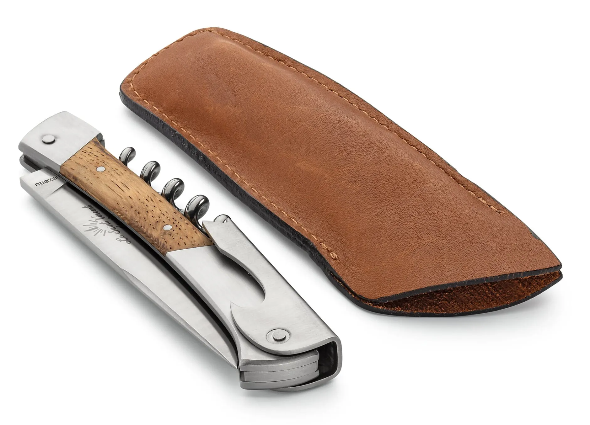 Sommelier-Messer mit Kapselheber und Korkenzieherspindel. Geschmiedete Taschenmesser-Klinge aus Sandvik®-Stahl. Grifflänge 12,5 cm, Klingenlänge 9 cm. Gewicht ca. 135 g. Im Lederetui, das bei Lieferung von einer Papphülse geschützt wird.