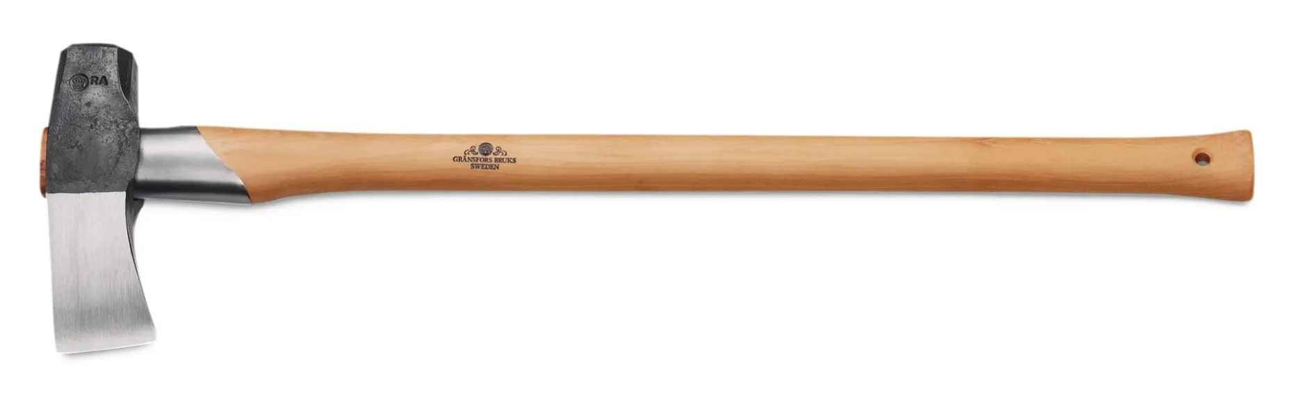 Dieses respekteinflößende Werkzeug heißt Spalthammer, weil der Nacken des ca. 2 kg schweren Blatts als Hammerbahn ausgeformt und nicht durchgehärtet ist. Sie können den Spalthammer also bei Bedarf – etwa wenn mit einem Dreh-Spaltkeil gearbeitet wird – einfach umdrehen. Er ist zusätzlich mit einer Stielschutzmanschette aus Stahl versehen.
