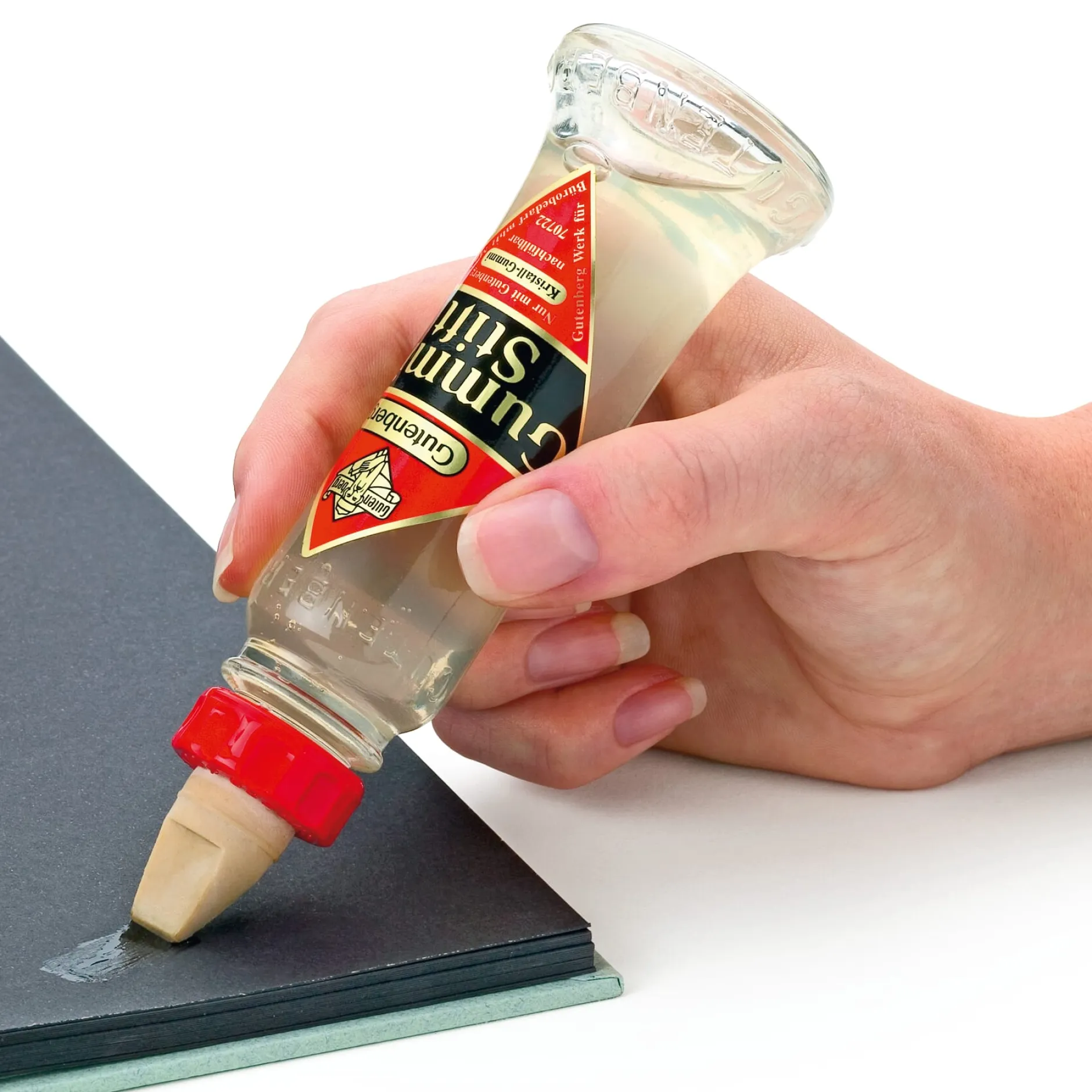 Seit 60 Jahren der schonende Kleber für Büro und Haushalt, hergestellt aus echtem Gummiarabikum, dem reinen Pflanzengummi, und dem natürlichsten Lösungsmittel: Wasser. Die natürlichen Grundstoffe greifen auch empfindliche Papiere nicht an. Der Inhalt hält etwa zwei Jahre – danach lässt die Klebekraft nach.