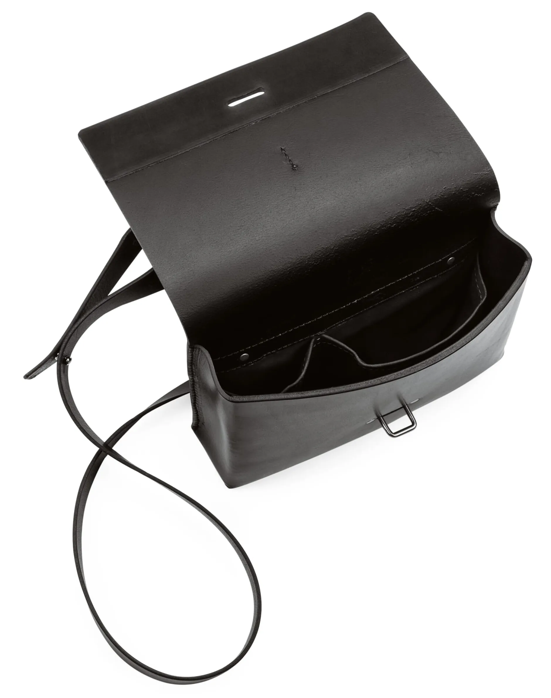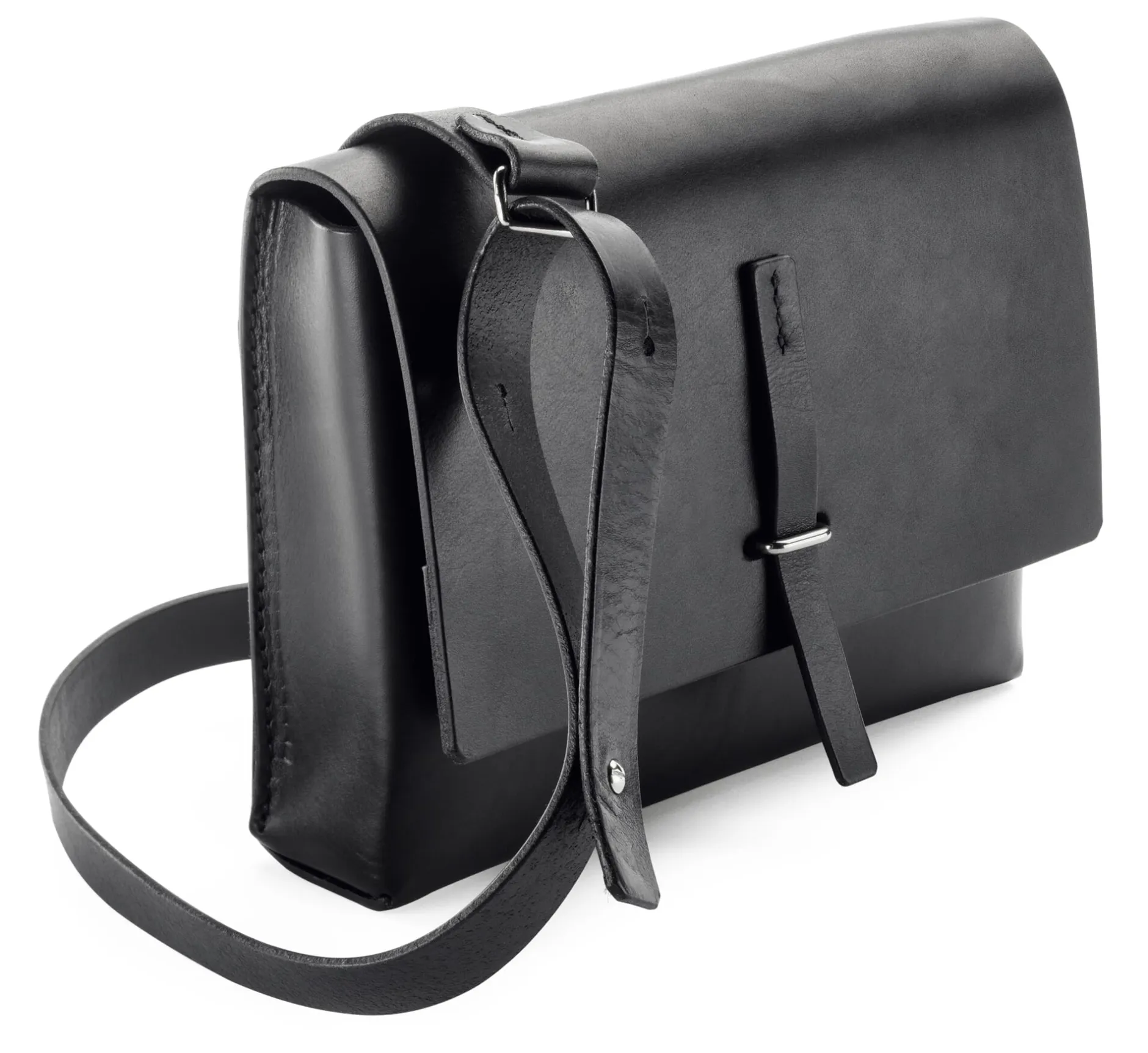 Dass diese kleine Ledertasche auf den ersten Blick recht unscheinbar wirkt, liegt an ihrer optisch absolut schlichten, handwerklich aber umso aufwendigeren Verarbeitung: Der Korpus ist aus einem Stück kräftigen Sattelleders (Stärke 2,5 mm) gearbeitet, das durch Falzen und Einfalten seine Form erhält. Je eine Naht hält die Seitenkanten zusammen, und nur eine weitere ist nötig, um den Taschenumschlag anzubringen. Diese Rückennaht hält gleichzeitig den Trageriemen, durch dessen Position die Tasche eng am Körper anliegt, wenn sie quer über dem Oberkörper getragen wird. Geschlossen wird sie mittels einer kleinen Lederlasche, die durch einen Metallsteg geschoben wird. Dieser stammt eigentlich aus dem Anhängerbau und hält sonst die Gurte und Riemen der Planen in Position.