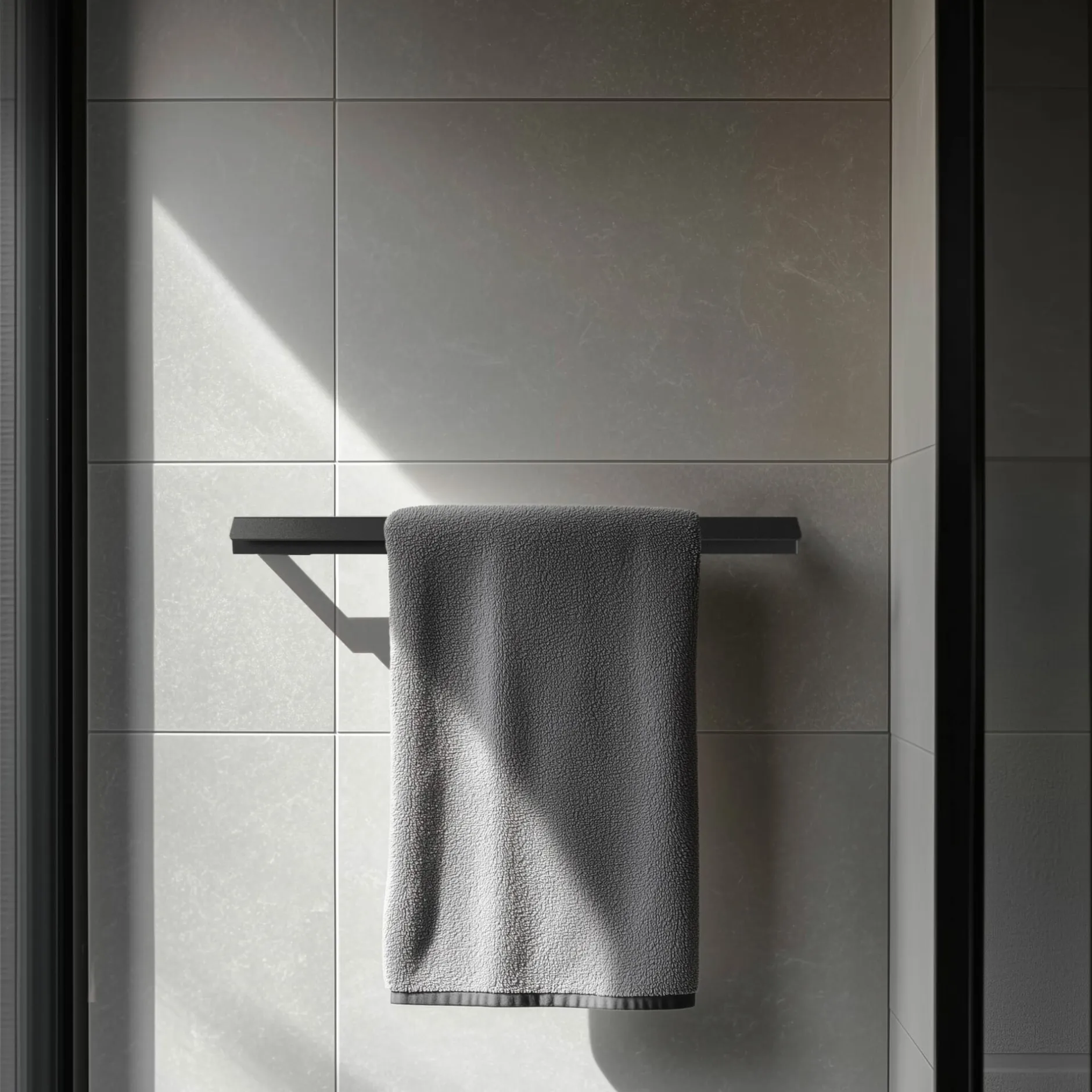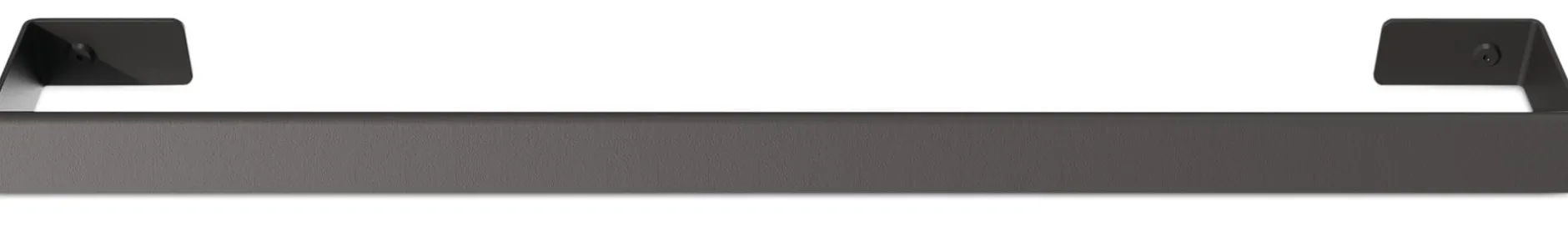 Handtuchhalter in grafisch-klarer Form aus gekantetem Aluminium, dem die matt-schwarze Pulverbeschichtung eine widerstandsfähige und wasserfeste Oberfläche verleiht. Mit seiner Breite von 60 cm bietet er Handtüchern und Duschtüchern einen Trockenplatz.