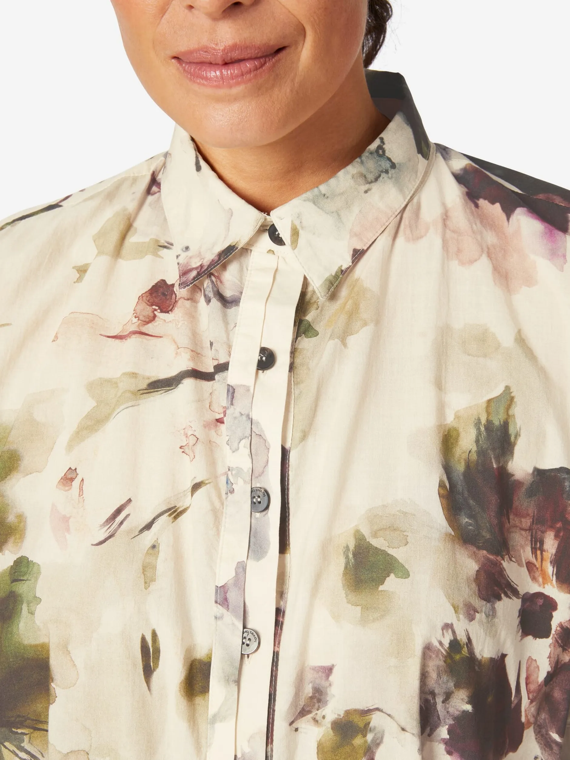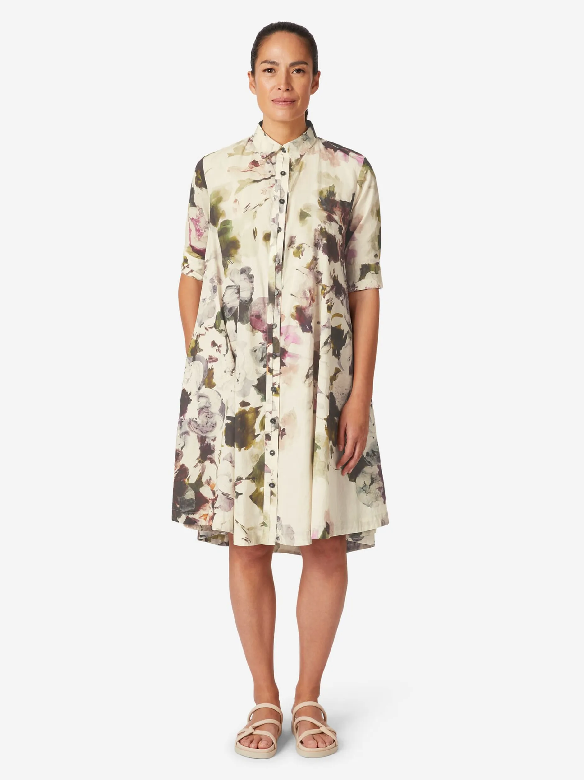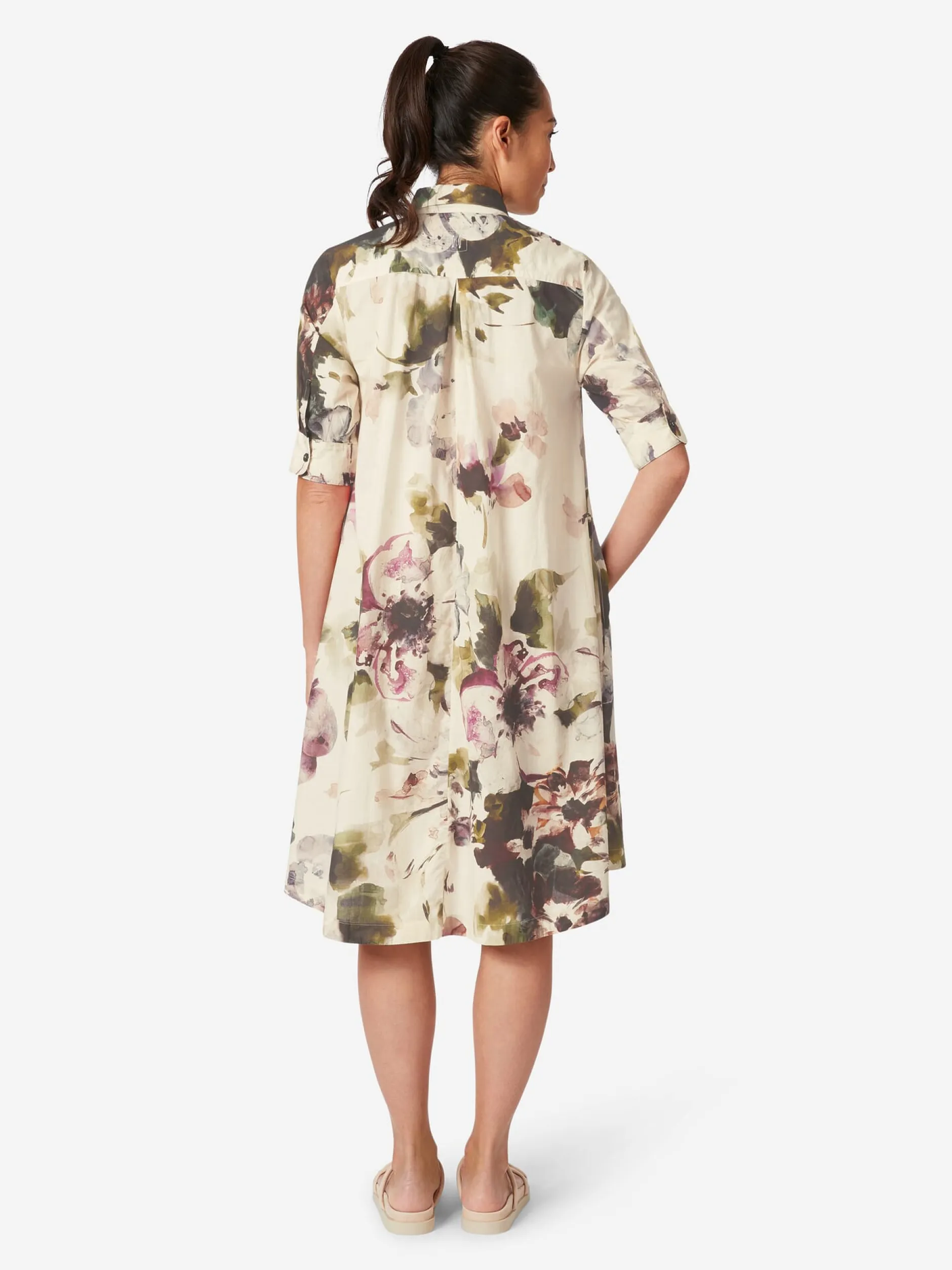 Mit seinem farbenfrohen großblumigen Muster ist dieses ungefütterte Kleid ein Hingucker und dank der legeren, figurumspielenden Passform und dem verwendeten Material der ideale Begleiter für warme Frühlings- und Sommertage. Hannes Roether konfektioniert es aus hautsympathischer und atmungsaktiver Baumwolle. Die ausgeprägte A-Linie verleiht dem Kleid Schwung und sorgt für viel Bewegungsfreiheit, wozu auch die aufspringende Kellerfalte unter der hinteren Schulterpasse beiträgt. Gearbeitet ist das Kleid mit durchgehender Knopfleiste, Hemdkragen, halblangen Ärmeln mit geknöpften Manschetten. Zwei nahteingesetzten Seitentaschen bieten Platz für Kleinteile des täglichen Bedarfs.