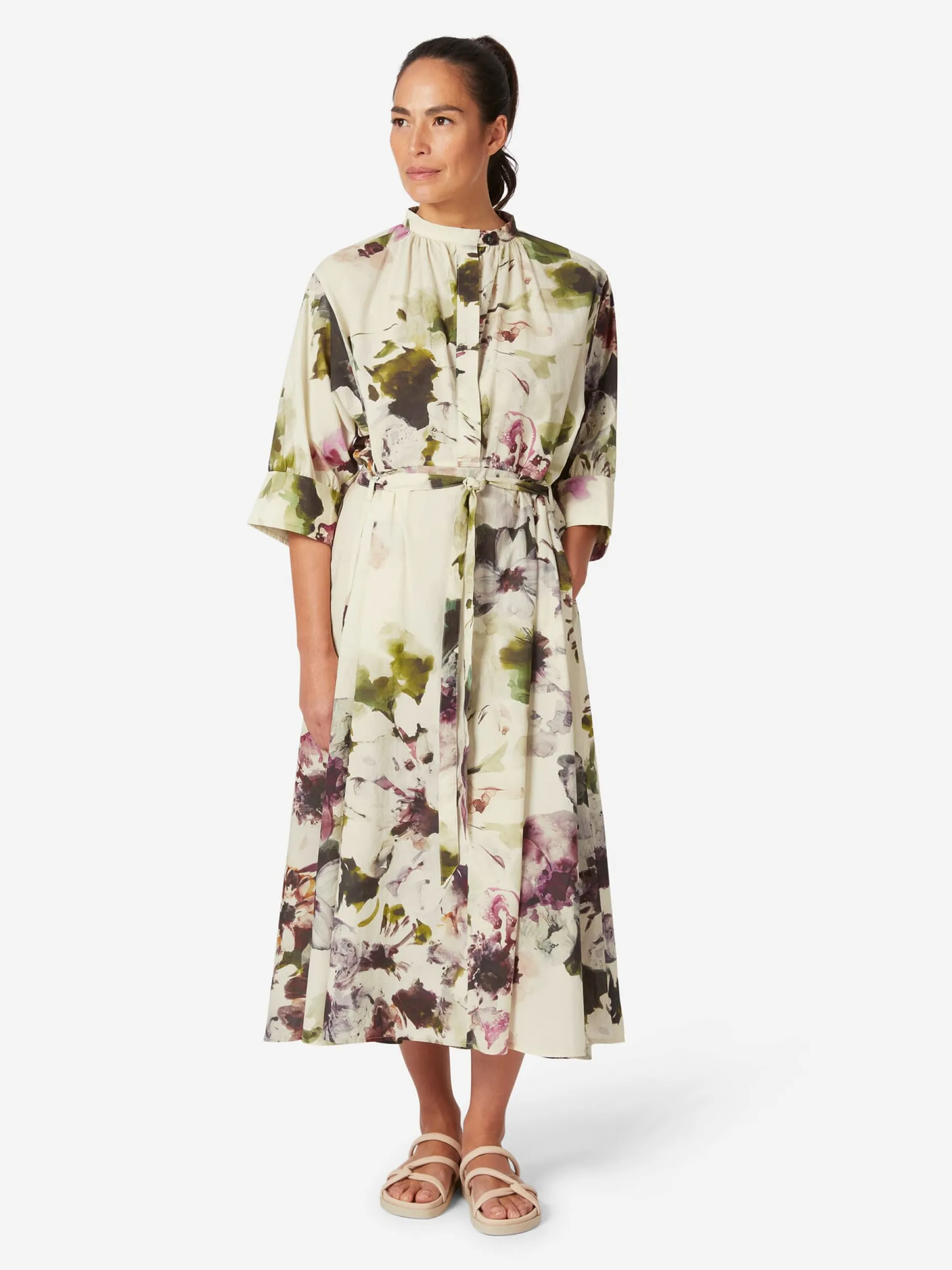 Sein lebhaftes, großblumiges Printmuster in frühlingsfrischen Farben macht dieses Kleid zum Hingucker. Hannes Roether fertigt es aus hautsympathischer, atmungsaktiver Baumwolle. Die legere, ausgestellte Passform verleiht dem Kleid Schwung und bietet viel Bewegungsfreiheit, wozu auch die aufspringende Kellerfalte unter der hinteren Schulterpasse beiträgt. Das Bindeband aus Oberstoff wird hinten geknöpft und erlaubt eine Weitenanpassung auf Taillenhöhe. Gearbeitet ist das ungefütterte Kleid mit Stehkragen, verdeckter Knopfleiste und halblangen Ärmeln mit gedoppelten, knöpfbaren Manschetten. Zwei in die Seitennaht eingesetzten Taschen bieten Platz für Kleinteile des täglichen Bedarfs.
