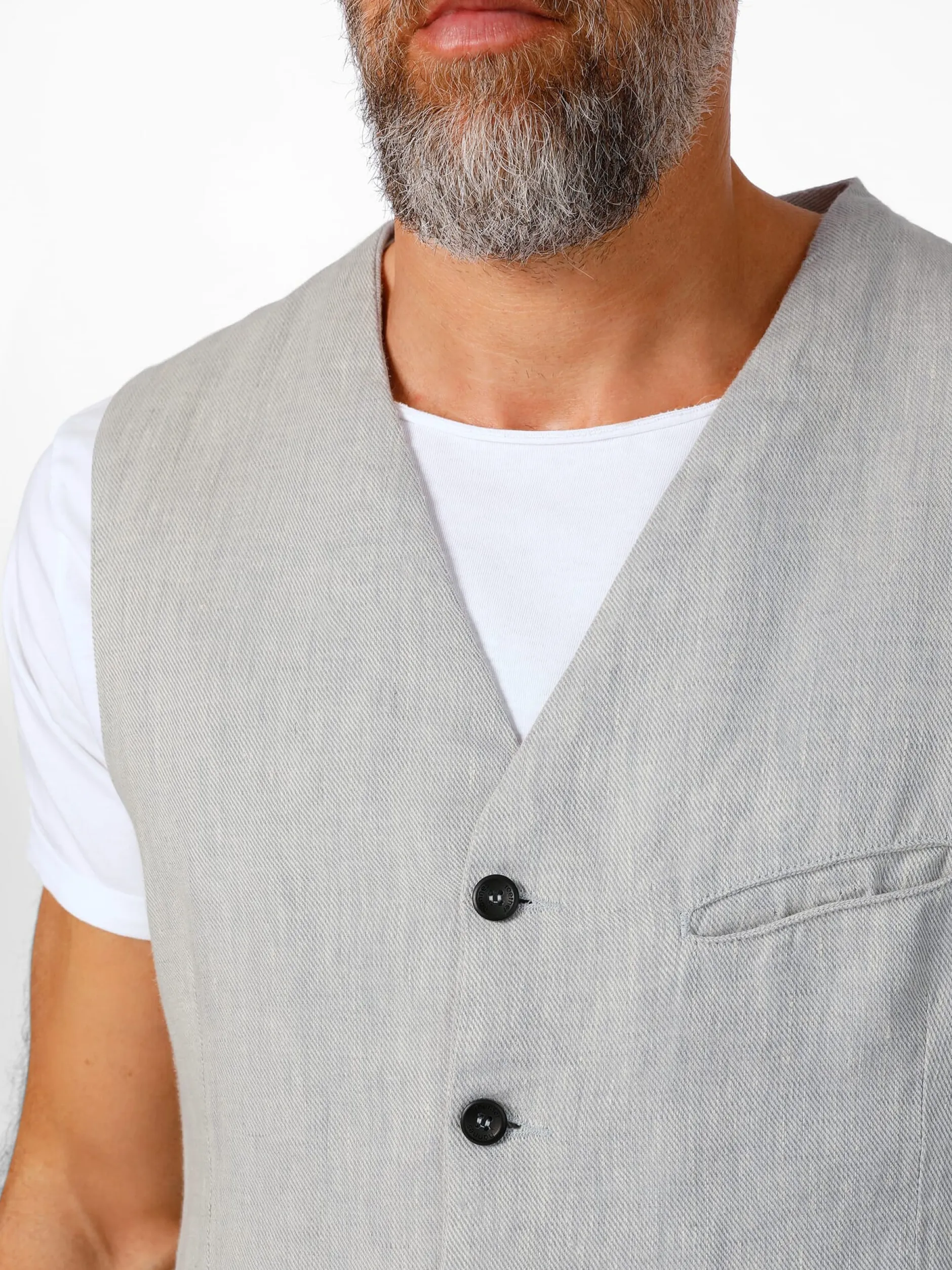 Das Vorderteil dieser kragenlosen Weste besteht aus Leinen in Naturtönen. Es ist in Köperbindung gewebt und zeigt neben dem markanten, diagonal verlaufenden Köpergrat einen schönen Melangeeffekt. Futter und Rücken der Weste bestehen aus hautsympathischer Baumwolle. Drei eingesetzte Taschen nehmen Kleinteile des täglichen Bedarfs auf. Ein Stoffriegel mit Metallschließe im Rücken erlaubt eine Anpassung der Taillenweite.