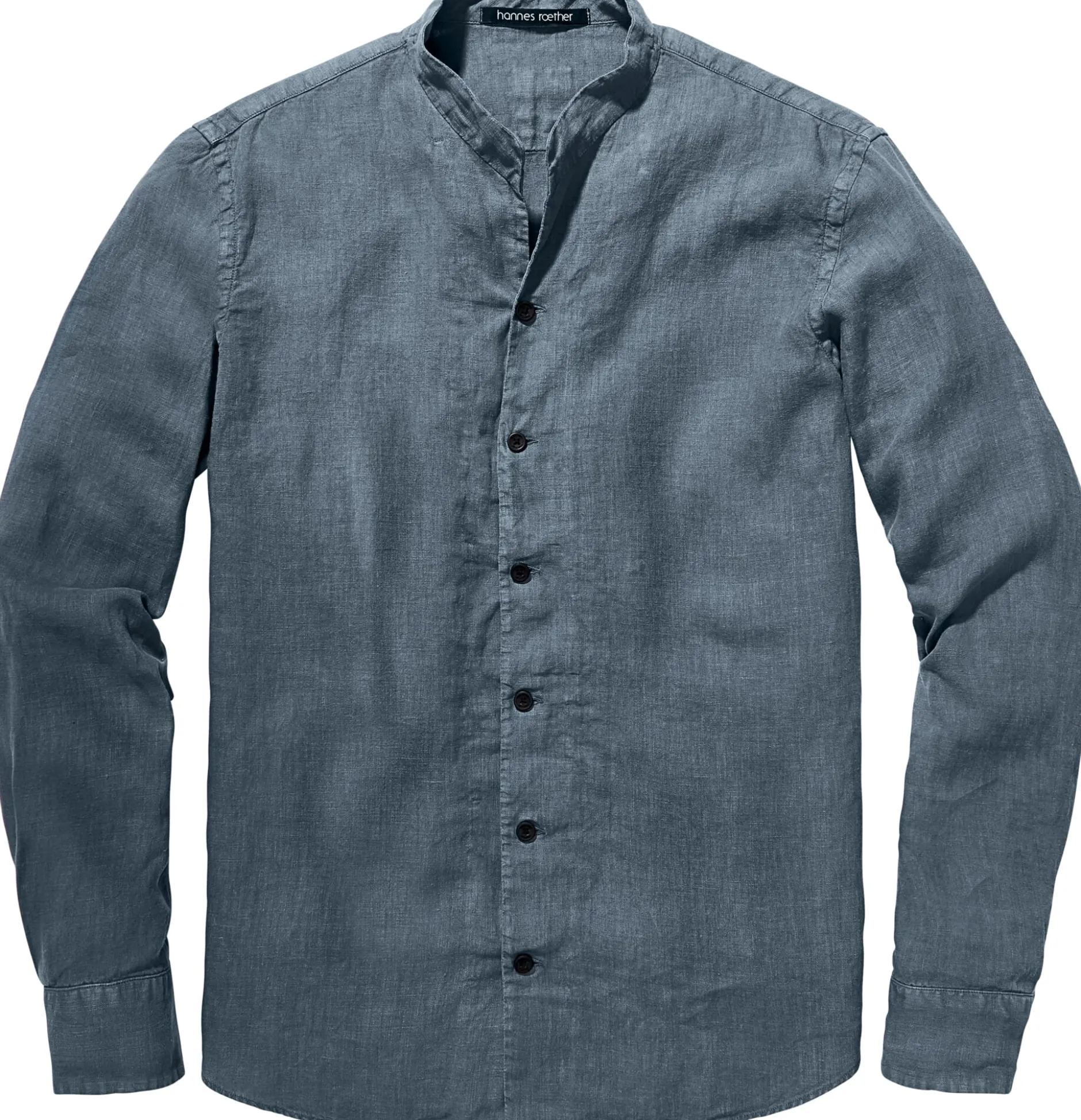 Das lässig-entspannte Erscheinungsbild dieses Hemds wird durch seine durchdachten Details geprägt. Das beginnt beim Stoff, der aus reinem Leinen besteht. Das markante Gewebe ist nicht nur strapazierbar und kühlend, es besitzt auch eine leicht unregelmäßige Struktur und den materialtypischen Edelknitter. Passend dazu zeigt es einen stark ausgewaschenen Effekt. Der Schnitt des Hemds ist gerade und locker fallend, der schmale Stehkragen bewusst ohne Knopf gearbeitet. Die Machart ohne Brusttasche kommt dem lässigen Look ebenfalls zugute, zugleich verstärkt sie den puristischen Gesamteindruck.