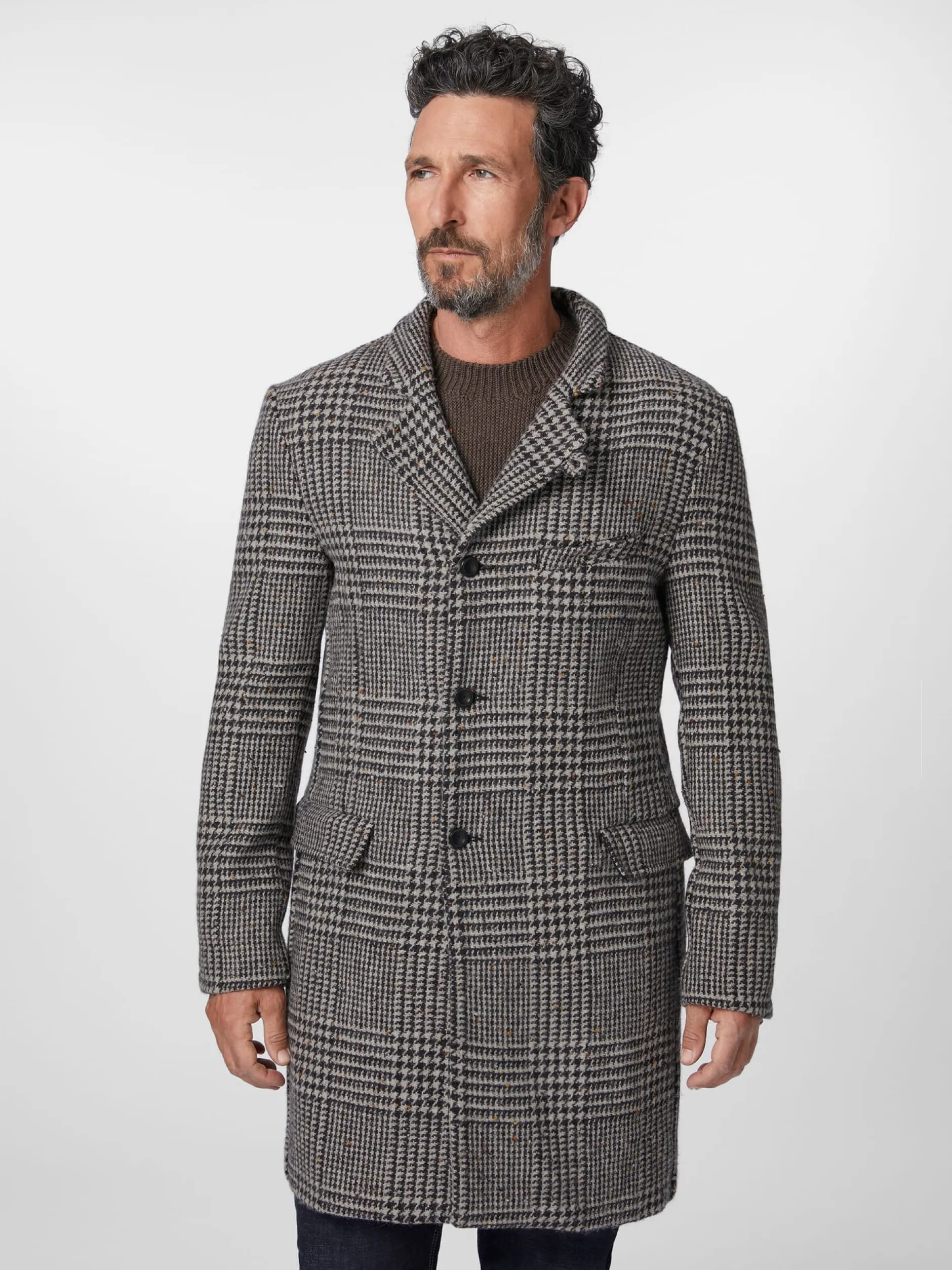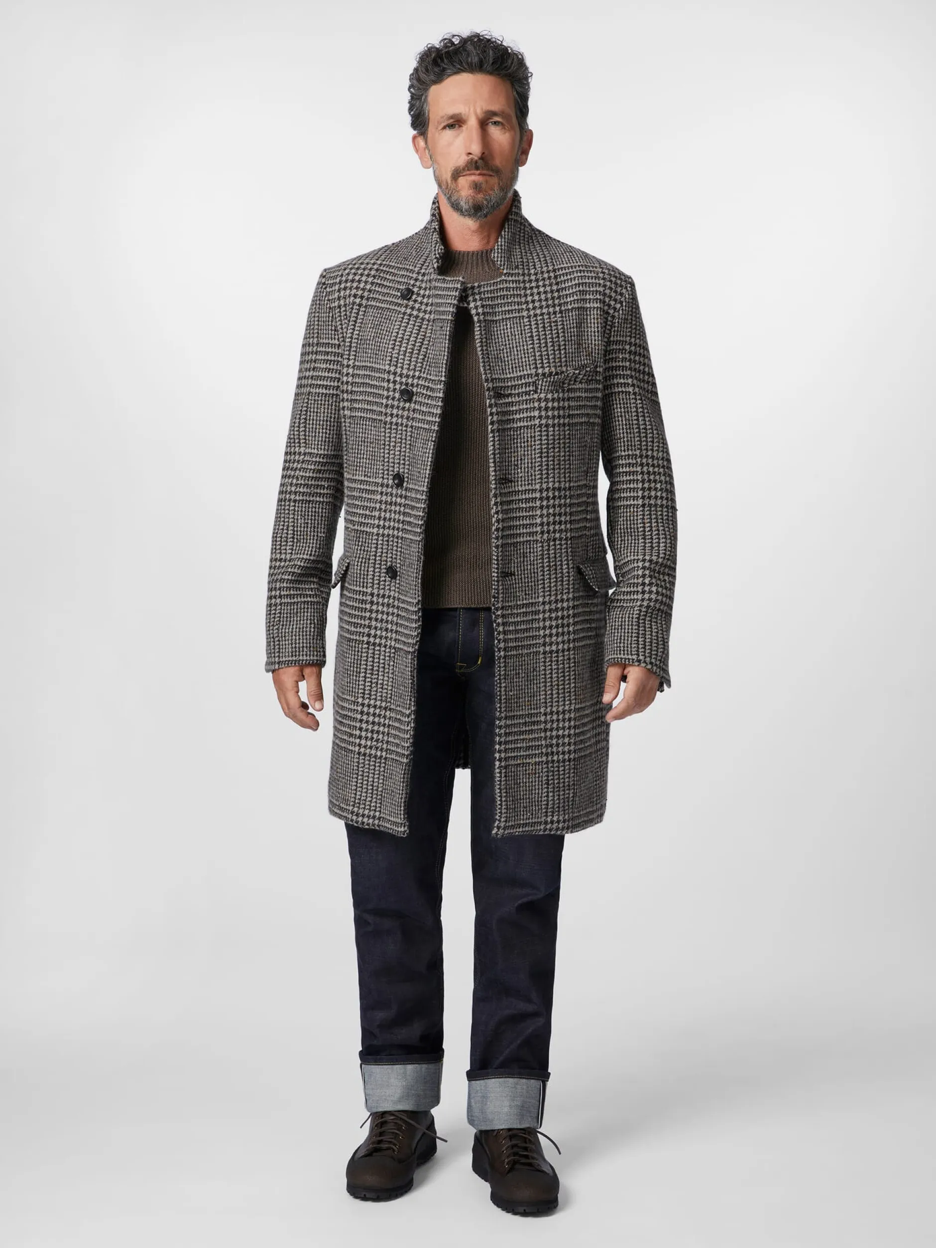 Das griffige wärmende Gewebe dieses Mantels zeigt nicht nur ein klassisches Glencheckmuster. Es besitzt auch farbige Einsprengsel, deren Fasern wie die „flecks“ beim berühmten irischen Donegal Yarn fest in die Garne eingearbeitet sind. Dies gibt dem Stoff ein besonders markantes Erscheinungsbild. Für die wärmenden Qualitäten sorgt der Umstand, dass der Oberstoff zu 90 Prozent aus Schurwolle besteht, zehn Prozent Polyamid machen ihn strapazierbarer. Der Mantel ist teilgefüttert, wobei das Rumpffutter aus reiner Baumwolle besteht, während die Ärmel mit Polyester gefüttert sind, was das An- und Ausziehen erleichtert. Die Ärmelenden sind geknöpft, ein Rückenschlitz erhöht den Tragekomfort. Zwei eingesetzte Taschen mit Patten sowie eine Innentasche nehmen Kleinteile des täglichen Bedarfs auf.