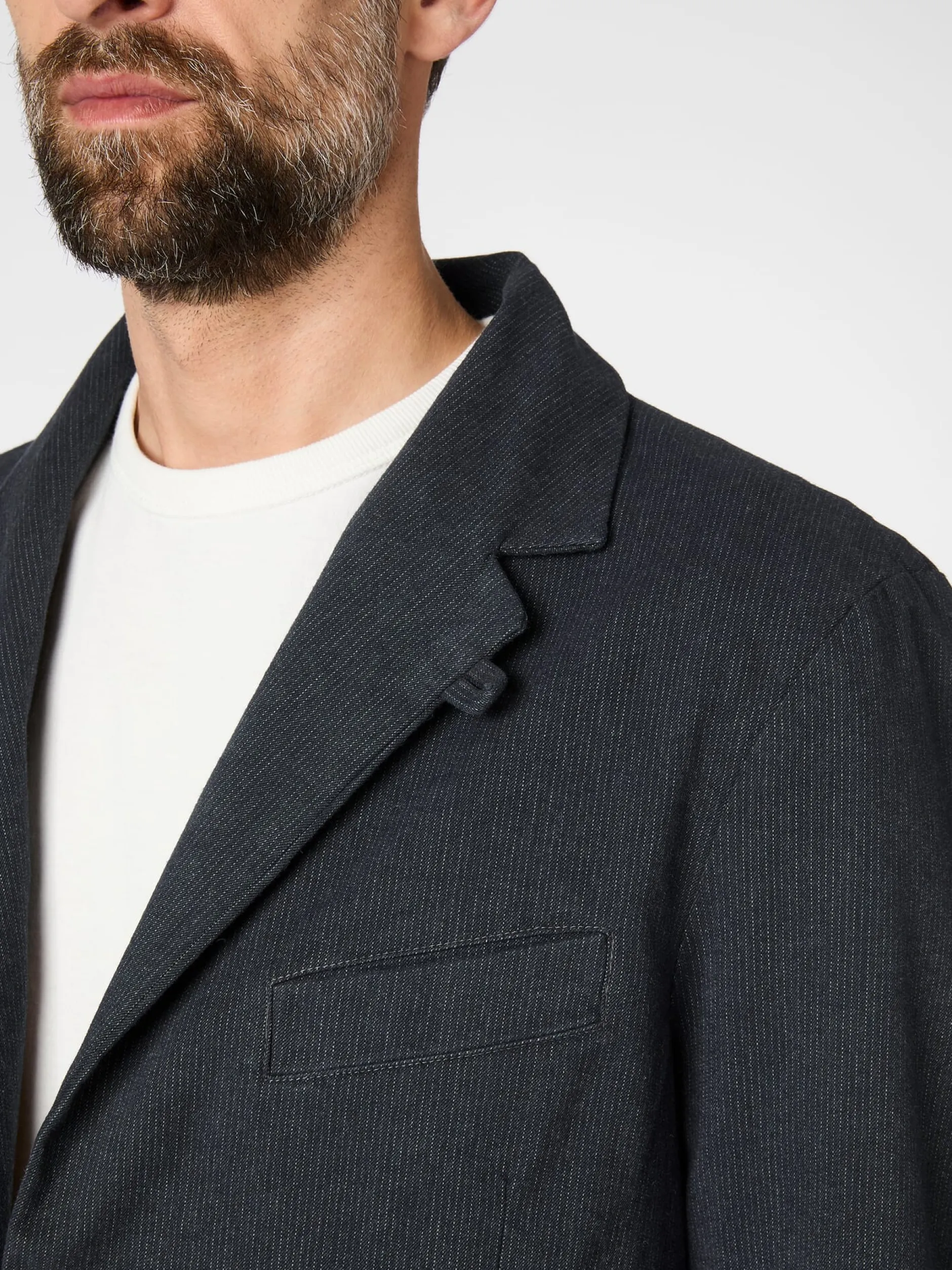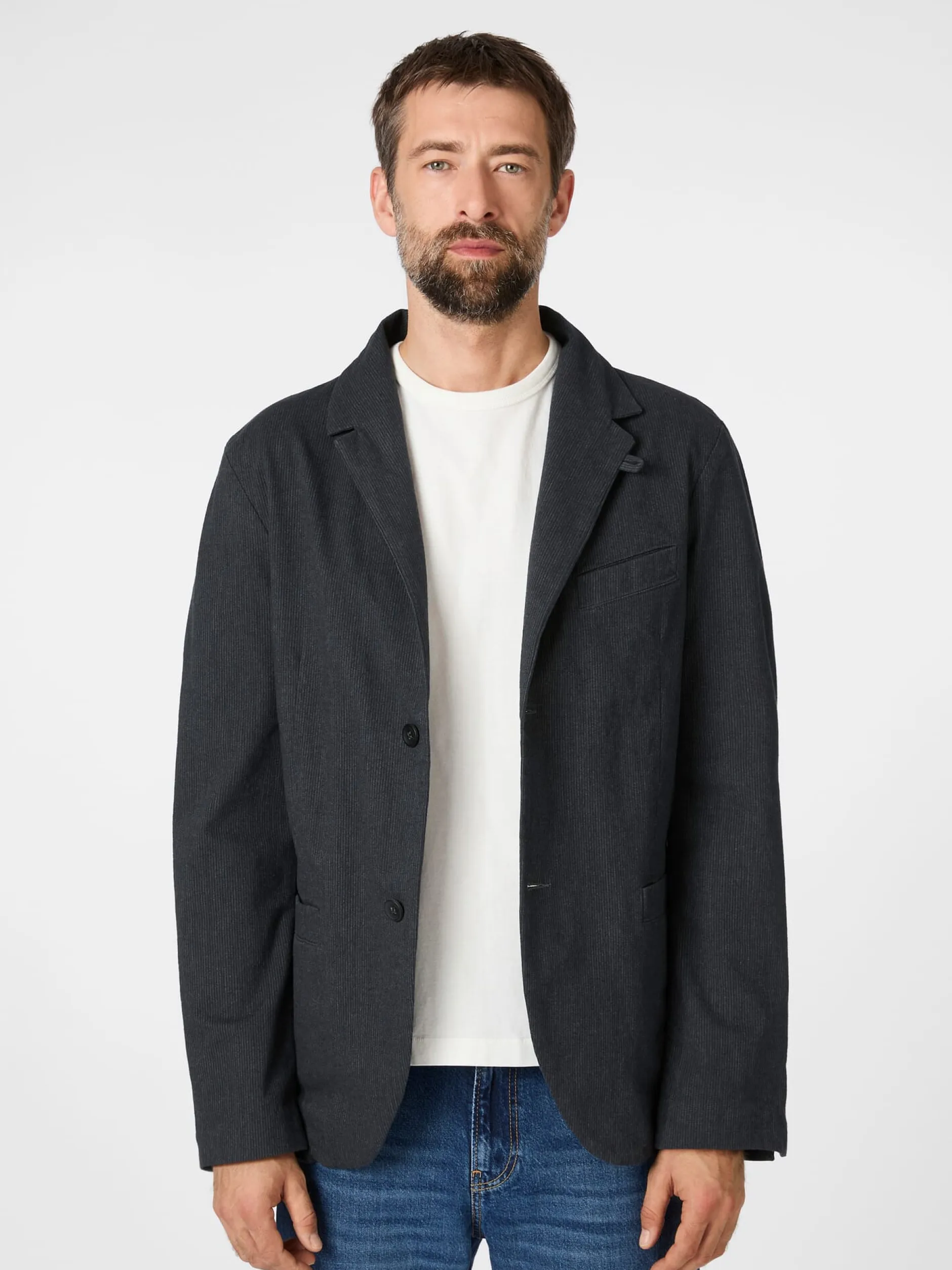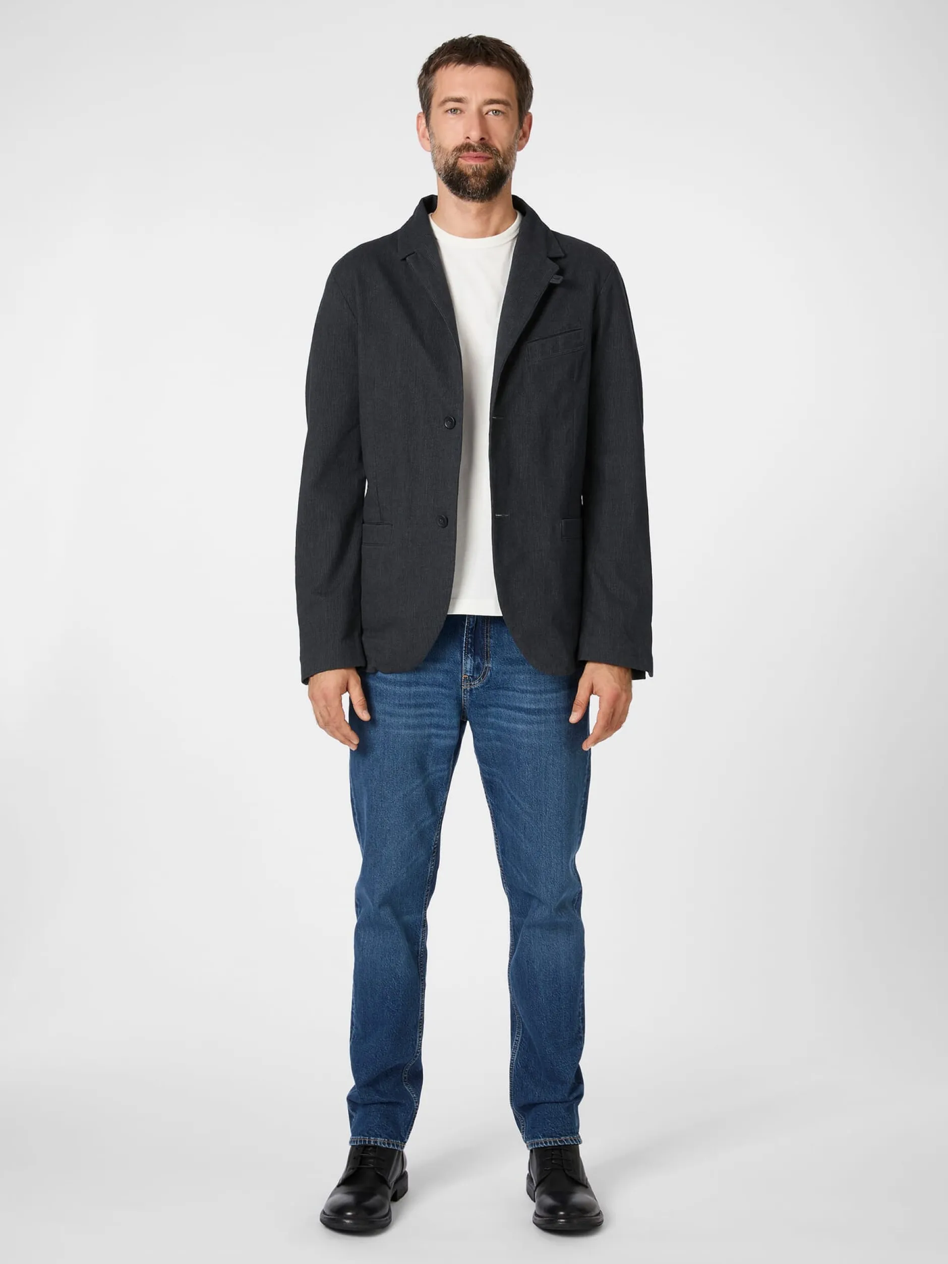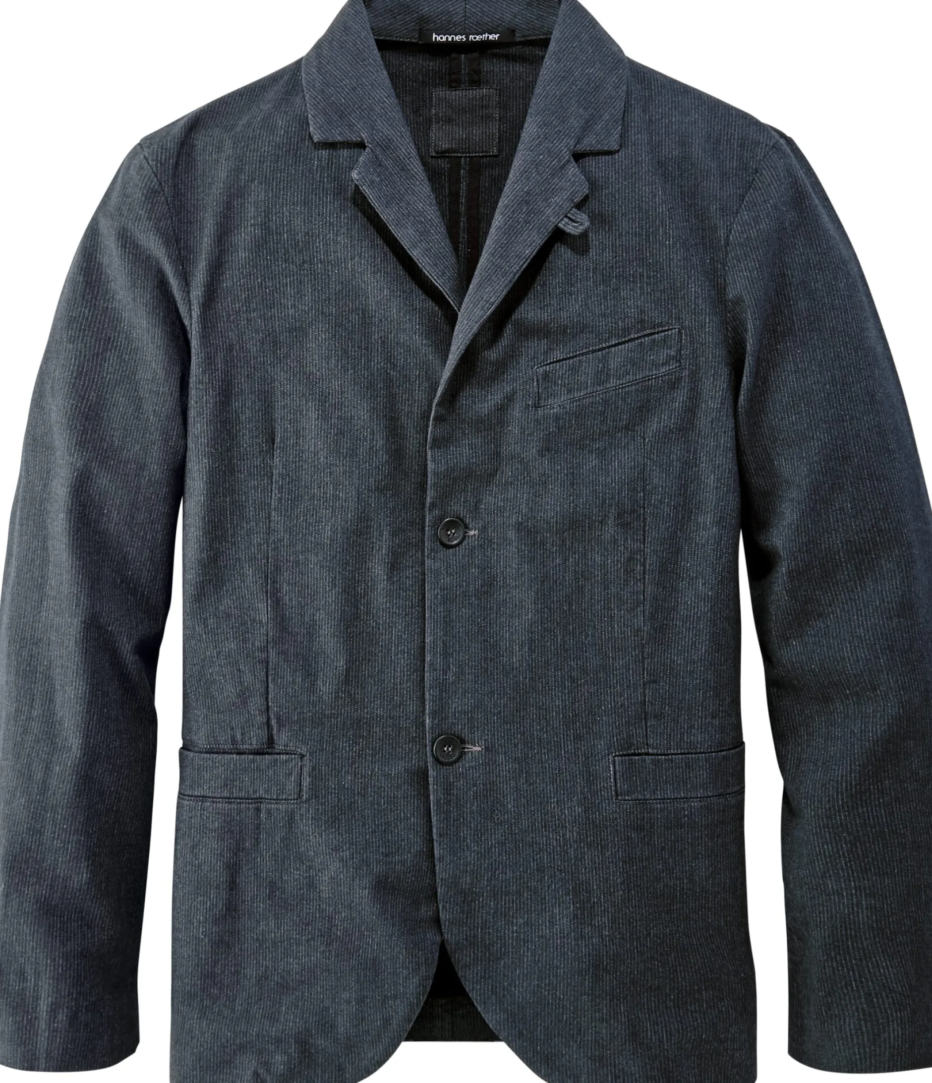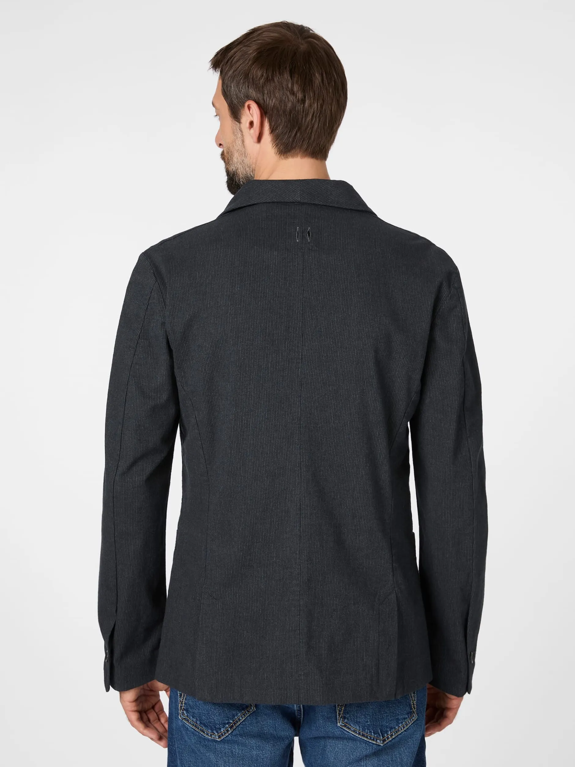 Dieses gerade geschnittene Sakko ist mit gerundeten Vorderteilen gearbeitet. Es hat ein Teilfutter, die sichtbaren Nähte sind innen sauber paspeliert. Abnäher im Vorderteil und Teilungsnähte im Rücken geben dem Sakko Form, eine markante Längsteilungsnaht im Rücken verschlankt und längt es optisch. Zwei Rückenschlitze erhöhen den Tragekomfort. Drei eingesetzte Taschen bieten Platz für Kleinteile des täglichen Bedarfs. Der weiche Baumwollstoff (mit etwas Elastananteil) zeigt ein feines Webmuster aus strukturierten Nadelstreifen.