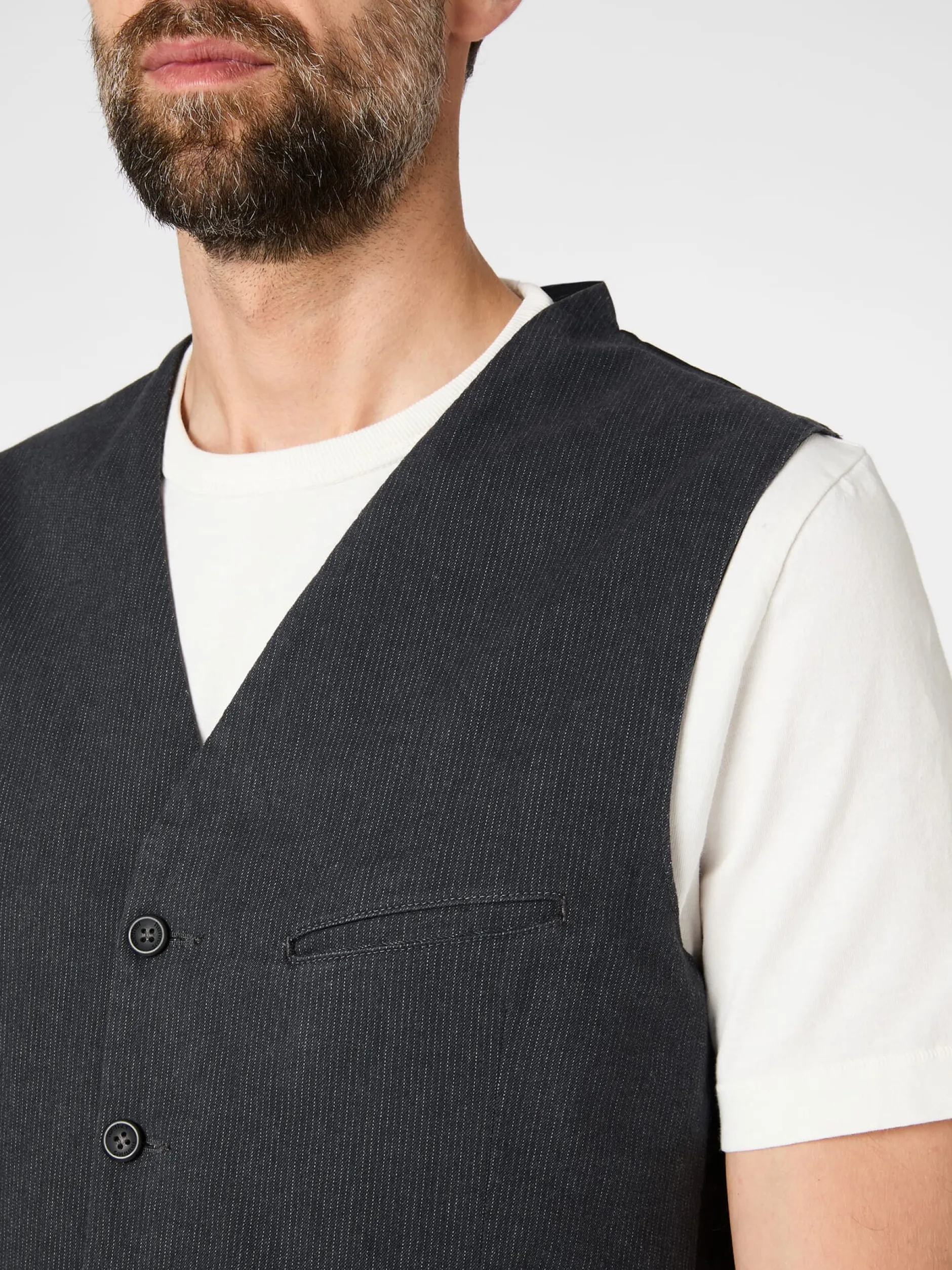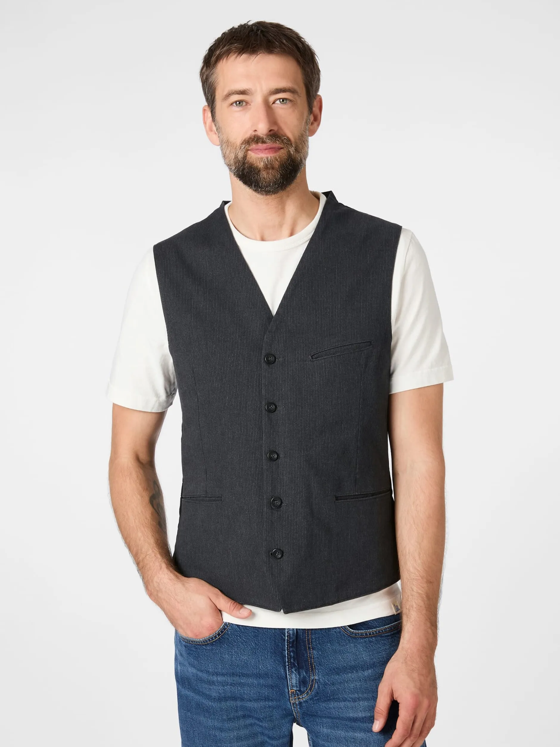 Das Vorderteil dieser hoch geknöpften, kragenlosen Weste besteht aus weichem Baumwollstoff (mit etwas Elastan), der ein feines Webmuster aus strukturierten Nadelstreifen zeigt. Darunter liegt ein unifarbener Baumwollstoff, aus dem auch der Westenrücken gearbeitet ist. Zwei Abnäher geben der Weste Form, drei eingesetzte Taschen nehmen Kleinteile des täglichen Bedarfs auf. Ein Stoffriegel mit Metallschließe erlaubt eine moderate Anpassung der Taillenweite.