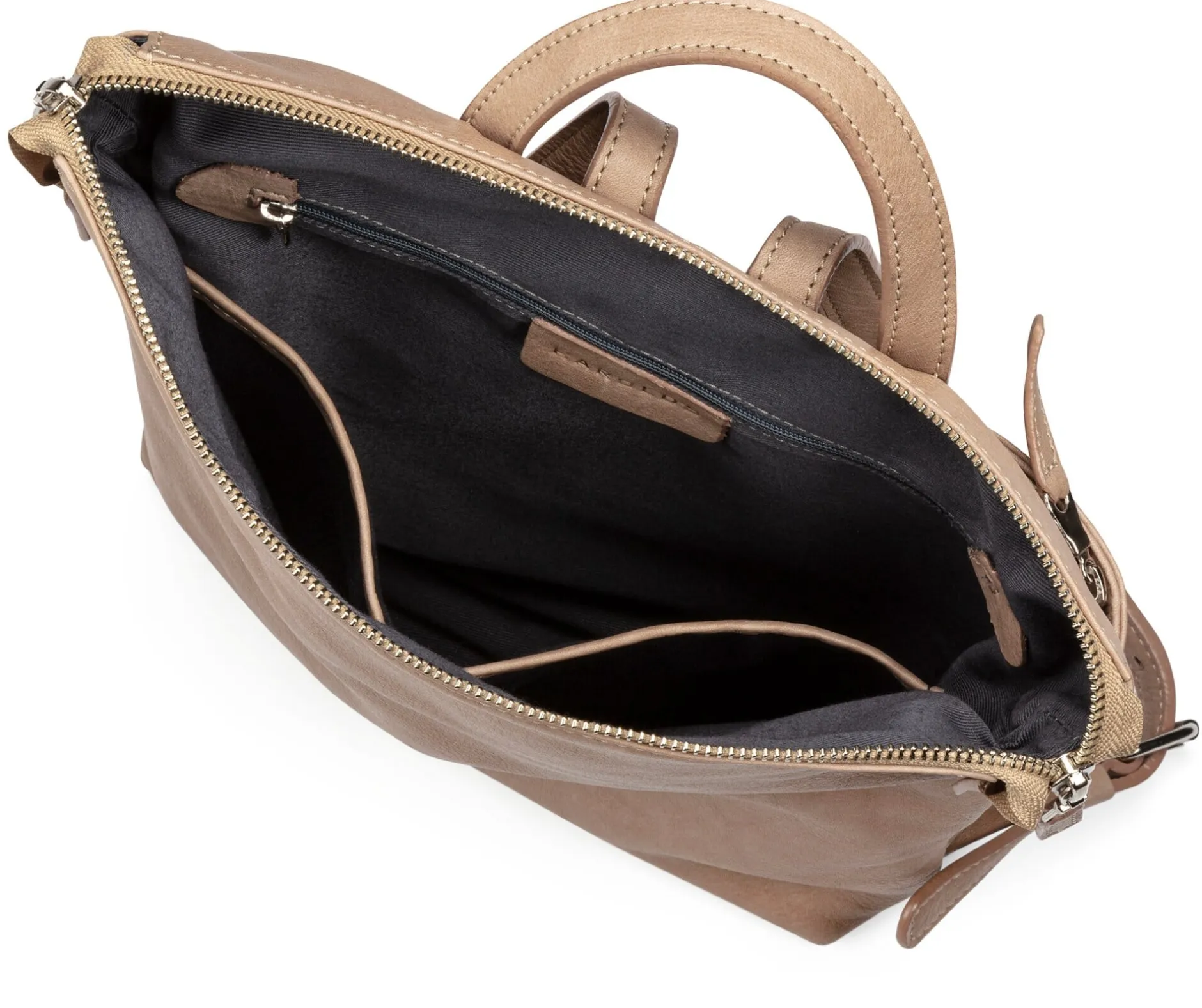 Das große Hauptfach ist mit grauem, strabazierbarem Köpergewebe gefüttert und mittels Reißverschluss zu schließen. Zwei Steckfächer und ein eingearbeitetes Reißverschlussfach bieten Kleinteilen Platz und helfen, die innere Ordnung zu halten. Außen nimmt ein großes Reißverschlussfach nahezu die ganze Fläche der Rückenfront ein (damit ist es vor Fremdeingriffen geschützt) und hält weitere Kleinteile wie Mobiltelefon, Tickets, Portemonnaie oder Schlüssel griffbereit vor.