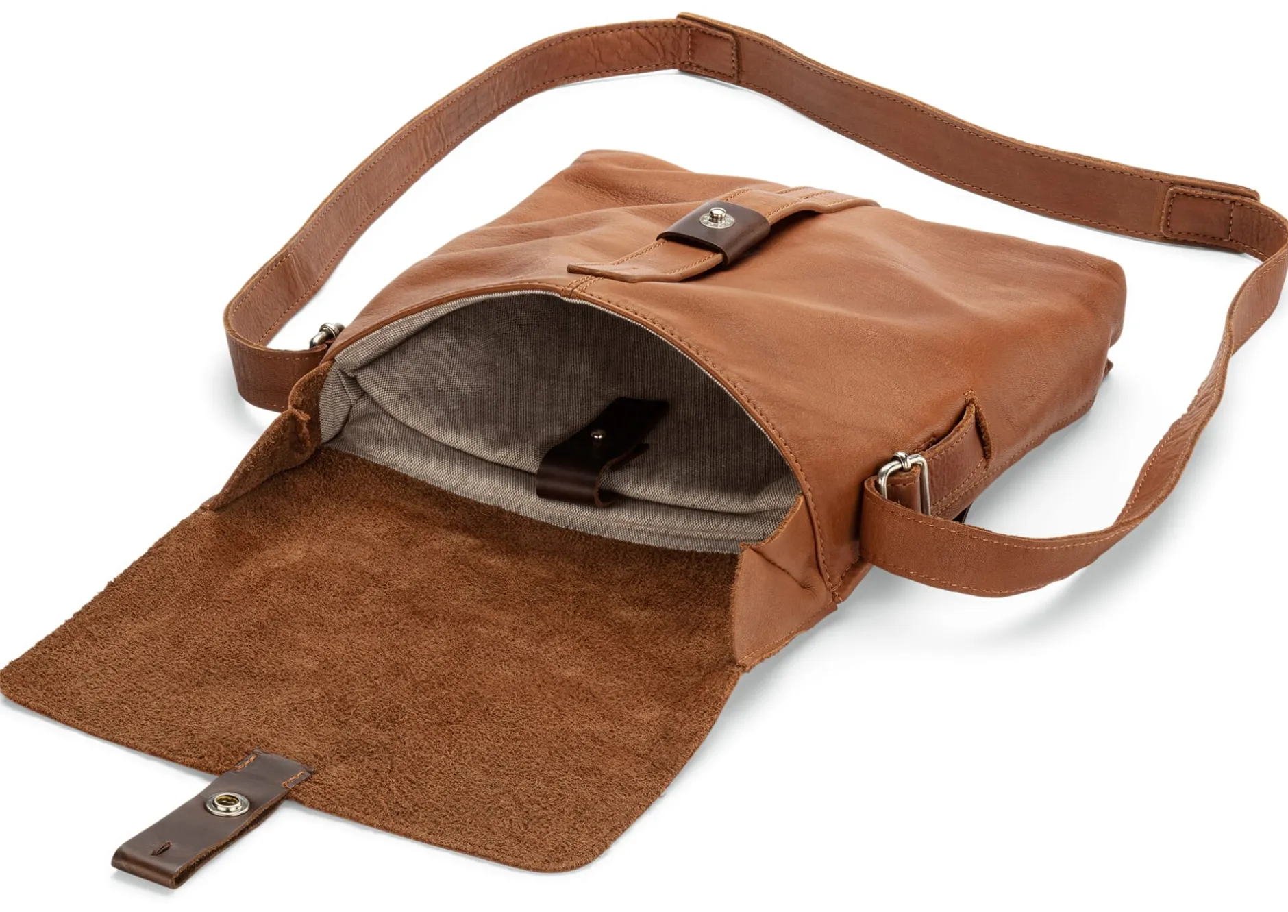 Schultertaschen im Hochformat sind eher selten, insbesondere wenn sie über ein gepolstertes Fach für das Tablet oder Notebook verfügen sollen. Wir haben daher mit Begeisterung diese Tasche aus weichem, vegetabil gegerbtem Rindleder in unser Sortiment aufgenommen. Ihr gepolstertes Steckfach (26 × 2 × 24 cm) nimmt Geräte auf. Das Volumen des Hauptfachs lässt sich durch den verschiebbaren Druckknopfverschluss am Überschlag etwas variieren. Eingearbeitete Seitenkeile gewährleisten dabei noch guten Schluss des Taschendeckels. Ein weiteres schönes Detail: Die Riemenenden des stufenlos verstellbaren Schultergurts lassen sich in kleinen Steckfächern an den Seiten versenken und stören nicht. Ein Reißverschlussfach sowie ein weiteres von der Seite vertikal zu öffnendes Reißverschlussfach auf der Taschenrückseite verwahren griffbereit Schlüsselbund oder Telefon. Die Tasche ist mit einem robusten Stoff aus Baumwolle mit einem 14-prozentigen Anteil Polyester für längere Haltbarkeit gefüttert.