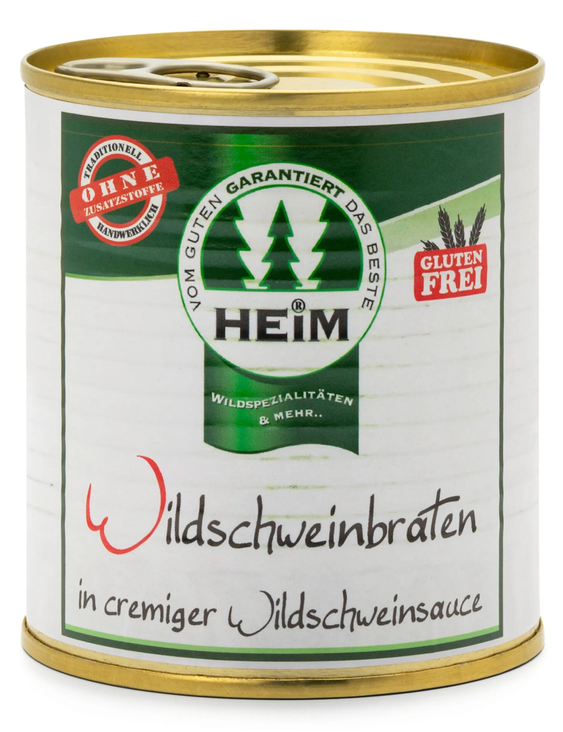 Wildschweinbraten in Scheiben enthält diese Dose. Der beim Anbraten gewonnene Fleischsaft bildet neben den angerösteten Wildknochen die Basis für die feine, cremige Sauce. Erlesene Wildgewürze und Crème fraîche runden den milden und zugleich wildtypischen Geschmack dieser Spezialität ab.