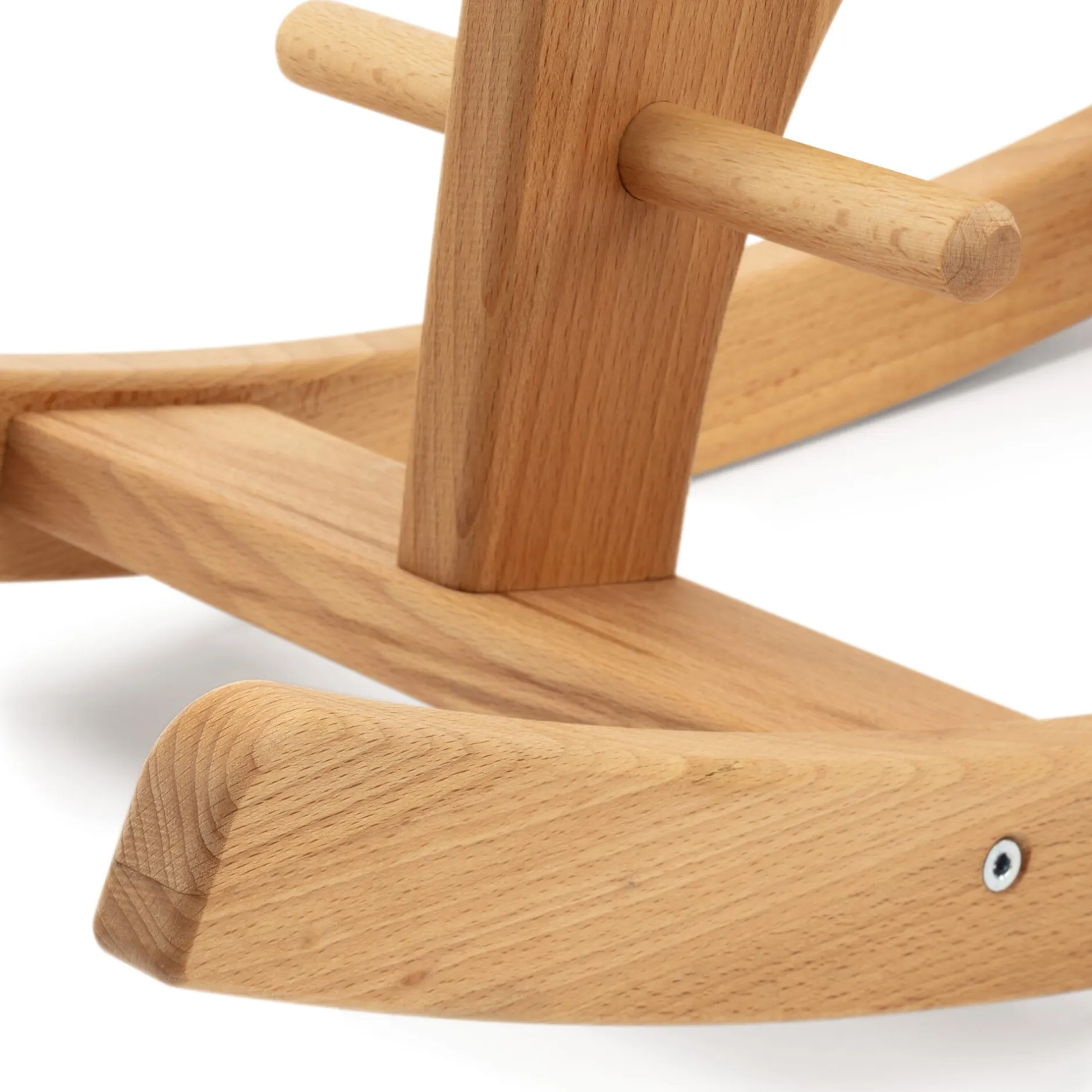 Auf dem trapezförmigen Sitz mit Rückenstütze können sich junge Reiter*innen bequem niederlassen, während der Sicherheitsbügel sie fest umfängt und hoch zu Ross hält, solange sie diese Hilfestellung benötigen – sobald sie sicher selbstständig sitzen und schaukeln, kann der Bügel auch abgenommen werden. Auf diese Weise bietet sich das Schaukelpferd über lange Zeit als treuer Spielgefährte an. Zusätzlichen Halt verleihen die Fußtritte aus Buchenholz; vor allem jungen Beinen dienen sie als Stütze, um Schwung zu holen. Nicht zuletzt fordert die klare, betont zurückhaltende Gestaltung die Phantasie des Kindes nachhaltig heraus – heute wilder Mustang, morgen sanfter Haflinger, übermorgen vorwitziges Fohlen – und erhebt das Schaukelpferd zu einem echten Blickfang in jedem Raum.