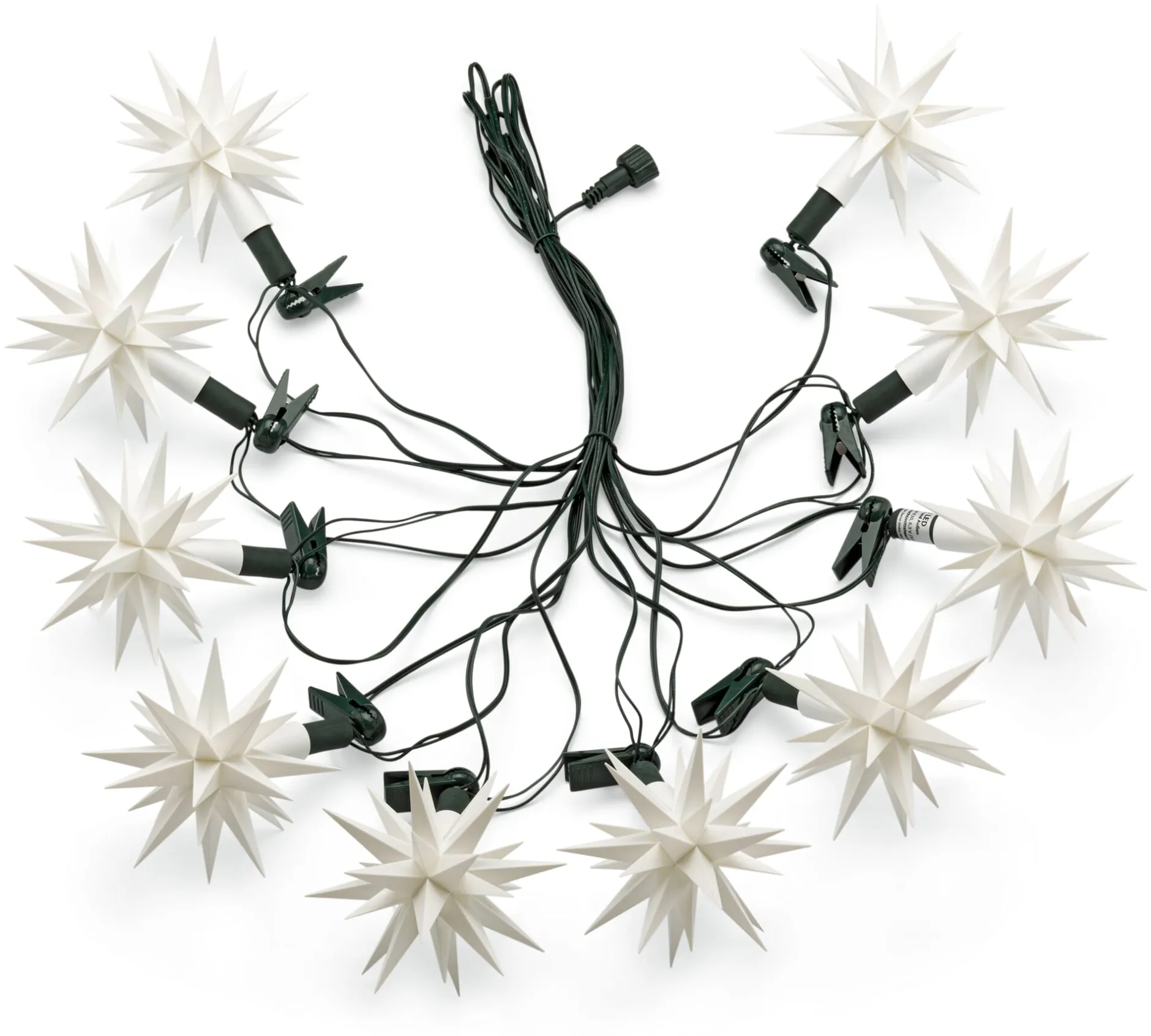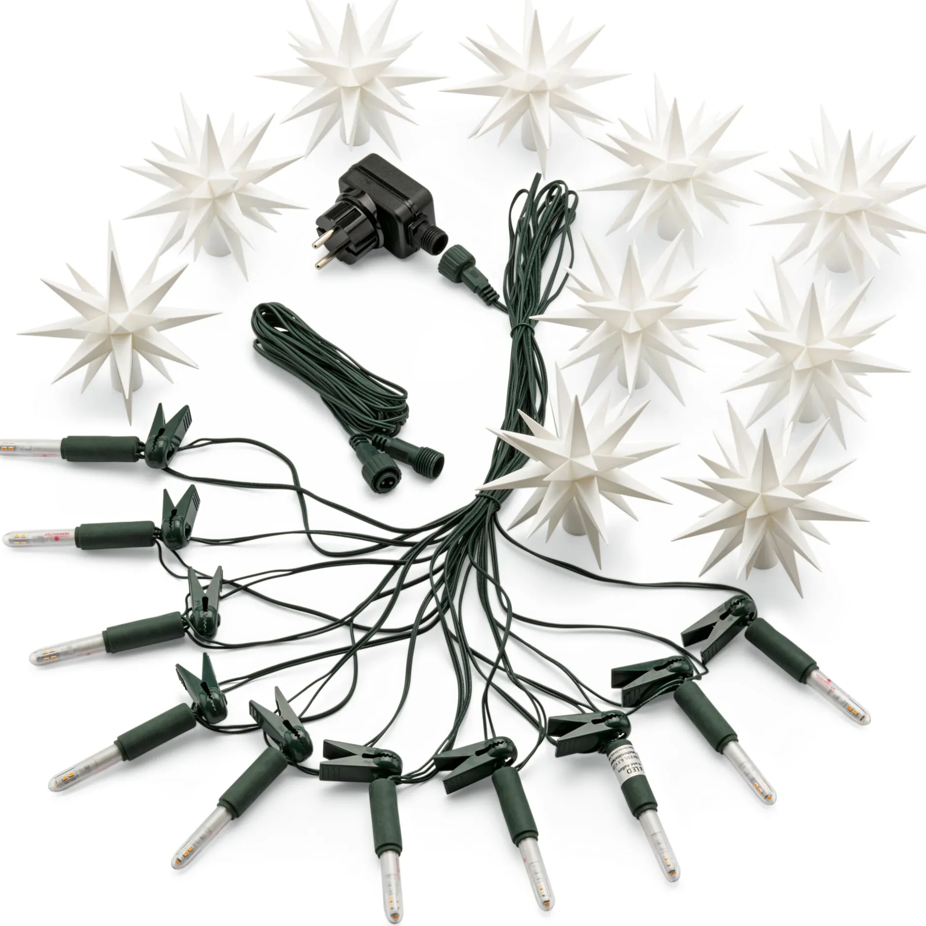 10 Kunststoffsterne (Polystyrol), jeweils ca. 13 cm Ø. Zum Aufstecken auf die mitgelieferte dunkelgrüne Lichterkette (230 V): Länge ca. 14 m, Lampenabstand ca. 1 m, Zuleitung zum ersten Stern ca. 5 m, mit Klammern zum Anheften an Zweige (max. 1 cm stark). 10 LED-Schaftkerzen (Fassung E10, jeweils 0,6 W). 1 Stecker-Trafo 6 V – 1,2 A. IP 44. Für den Innen- und Außengebrauch. Schutzkontaktstecker (Typ F).