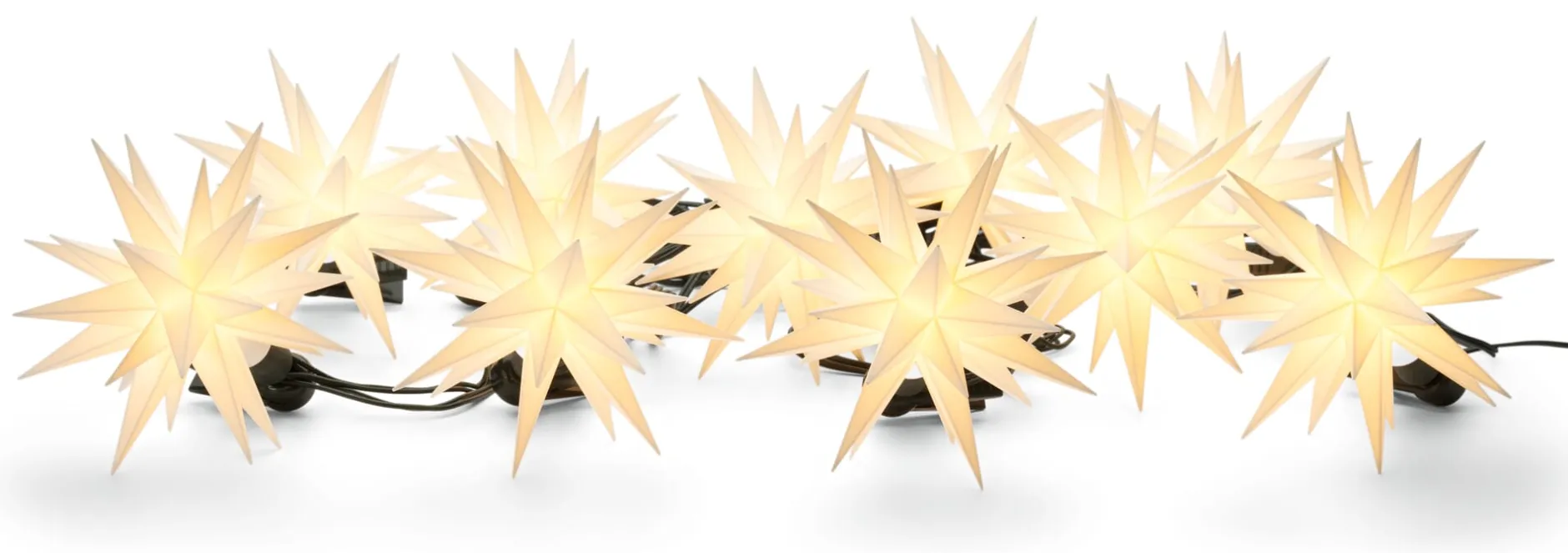 Der berühmte, mit 25 Strahlen beeindruckende Adventsstern der Herrnhuter Brüdergemeine erfreut sich einer ungebrochen großen Beliebtheit. Mit dieser Sternenkette können Sie nun Herrnhuter Sterne und Lichterkette miteinander kombinieren – sowohl drinnen wie auch draußen. Zehn originale Herrnhuter Sterne, in der kleinen Version mit 13 Zentimeter Durchmesser, reihen sich im Abstand von einem Meter auf der Lichterkette aneinander und lassen nicht nur Ihren Weihnachtsbaum, den Treppenaufgang oder die Fensterfronten, sondern ebenso Hauseingang, Balkon, Terrasse und Garten stimmungsvoll erstrahlen. Mit insgesamt 14 Metern bietet die Kette ausreichend Länge, um in festlich beschwingten Bögen von Advent und Weihnachten zu künden.