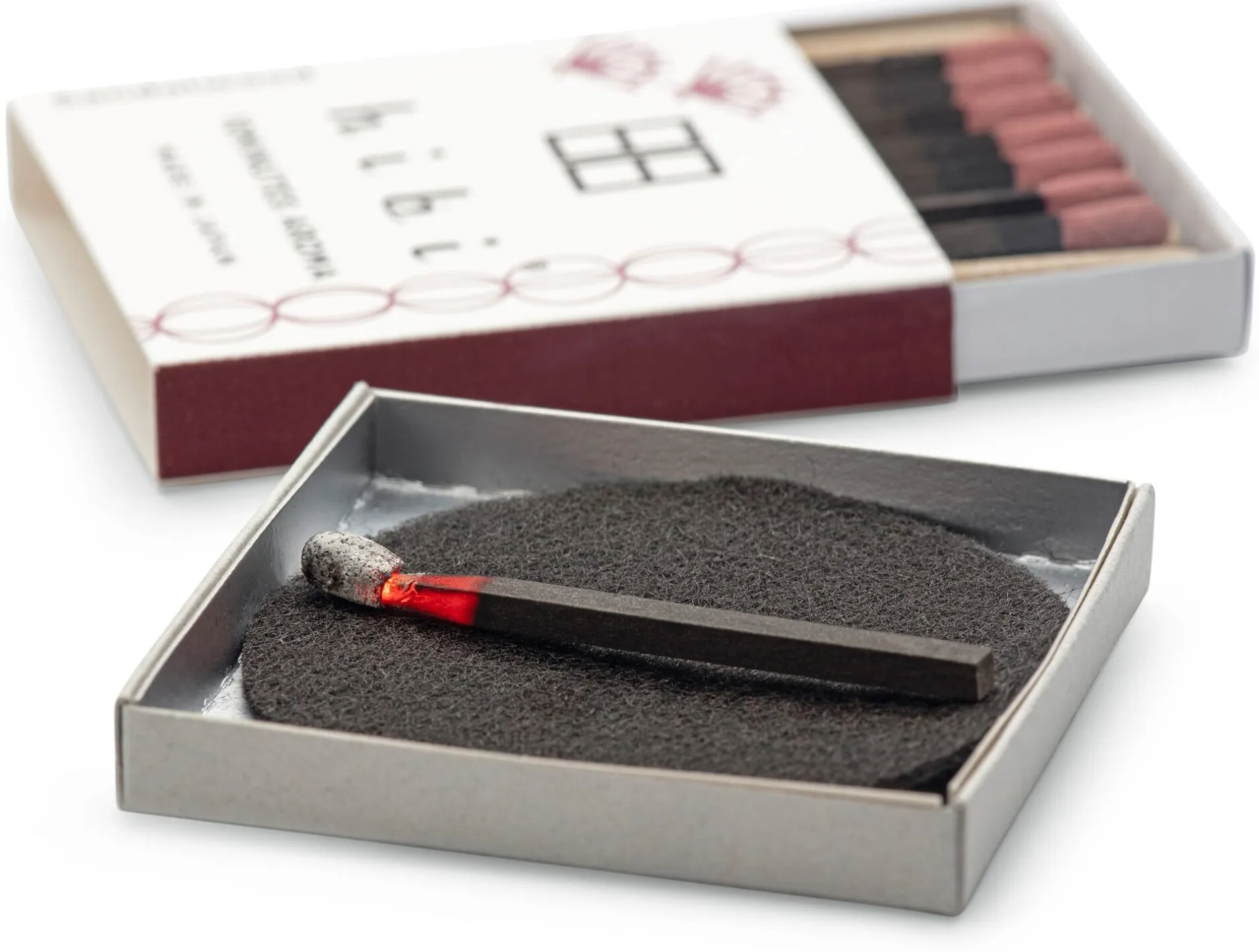 Die Idee zu diesen genialen Duftstreichhölzern hatte ein japanischer Streichholzhersteller. Die Suche nach einem zweiten Standbein – weil der Gebrauch von Streichhölzern seit Jahren stetig abnimmt und weil er selbst glühender Anhänger des Räucherns ist – brachte ihn auf den Gedanken, Räucherstäbchen im Kleinstformat zu entwickeln. Der richtige Partner für dieses Projekt wohnte gewissermaßen vor der Tür, denn am Firmenstandort in der Präfektur Hyogo hat nicht nur die Streichholzproduktion eine lange Tradition, sondern auch die Fertigung von Räucherstäbchen. 2011 begannen Kobe Match (seit 1929 mit der Fertigung von Streichhölzern befasst) und die 1897 gegründete Weihrauchmanufaktur Daihatsu die gemeinsame Entwicklungsarbeit und brachten drei Jahre später die kleinen duftenden Hölzchen auf den Markt. Den Aspekt des täglichen Räucherns nimmt das Logo übrigens auf: Es zeigt zweimal das chinesische Schriftzeichen 日 für Tag.