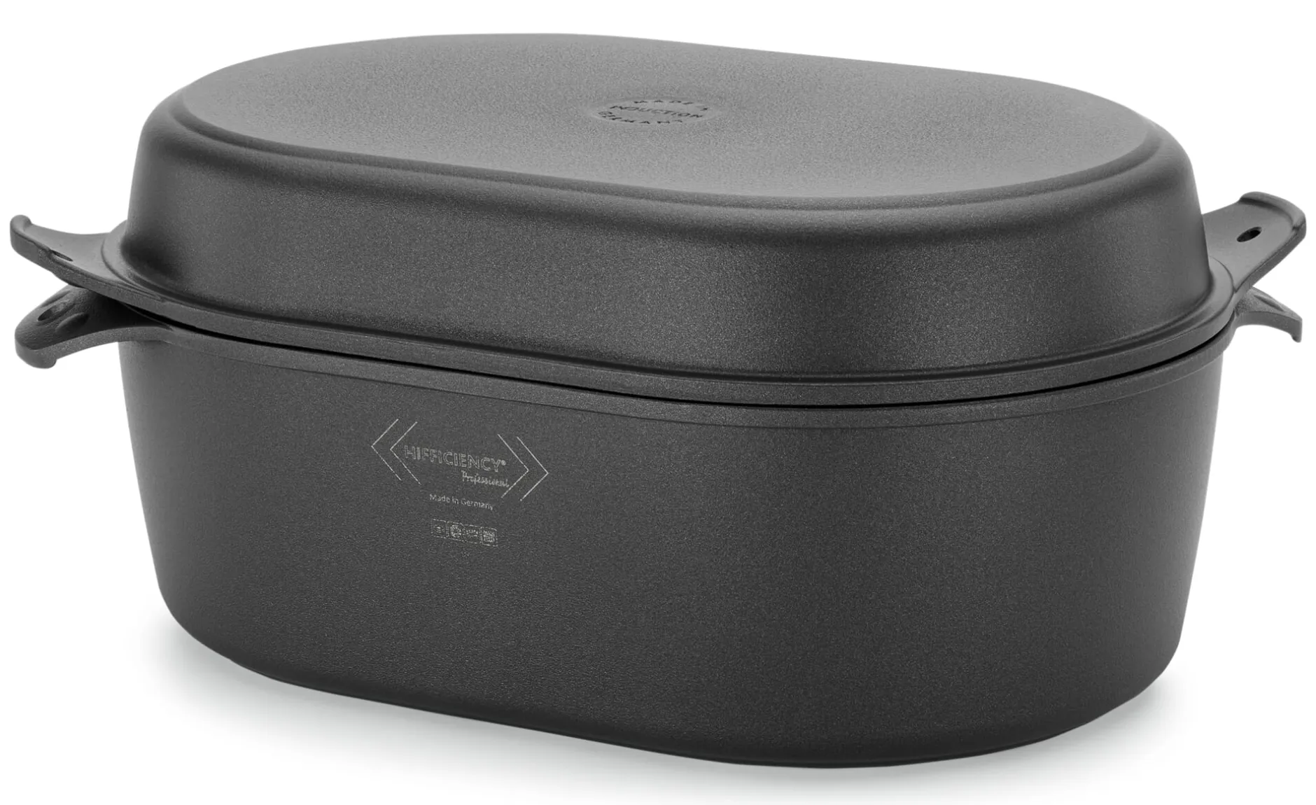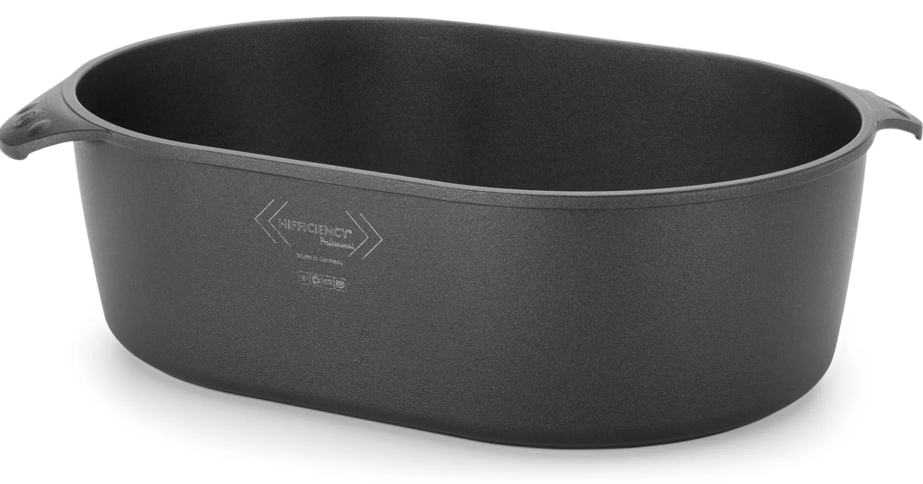 Seine Vielseitigkeit in der Küche verdankt der Hifficiency®-Bräter auch dem Material, aus dem er hergestellt wird. Aluminium gilt ähnlich wie Kupfer als schneller Wärmeleiter. So materialopulent in Form gegossen wie hier, verfügt Aluminium zugleich über ausgezeichnete Wärmespeicherkapazitäten. Eine Besonderheit stellt die durchgehende Antihaftbeschichtung aus Duraquarz® (Quarzkeramik und Polyetherketon) dar, die lösungsmittelfrei als Pulverlackierung aufgetragen, aber nicht eingebrannt wird. Sie bekommen mit diesem Bräter also sämtliche Vorteile einer Antihaftbeschichtung – inklusive der vereinfachten Reinigung –, müssen sich aber nicht um etwaige gesundheitsschädigende Bestandteile derselben sorgen. Wir haben nur eine Bitte: Achten Sie darauf, die Wärmezufuhr zu regulieren, also nicht auf der höchsten Stufe zu beginnen. Vor allem wenn Sie diesen Bräter auf dem Induktionsherd verwenden, kommt es darauf an, das beschichtete Material nicht zu überhitzen, daher gilt: mittlere Einstellung genügt. Und bitte denken Sie daran, zum Anbraten nicht mit Olivenöl zu arbeiten. Olivenöl wird in diesem Bräter erst sehr schnell zu heiß und dann sehr schnell verrauchen.