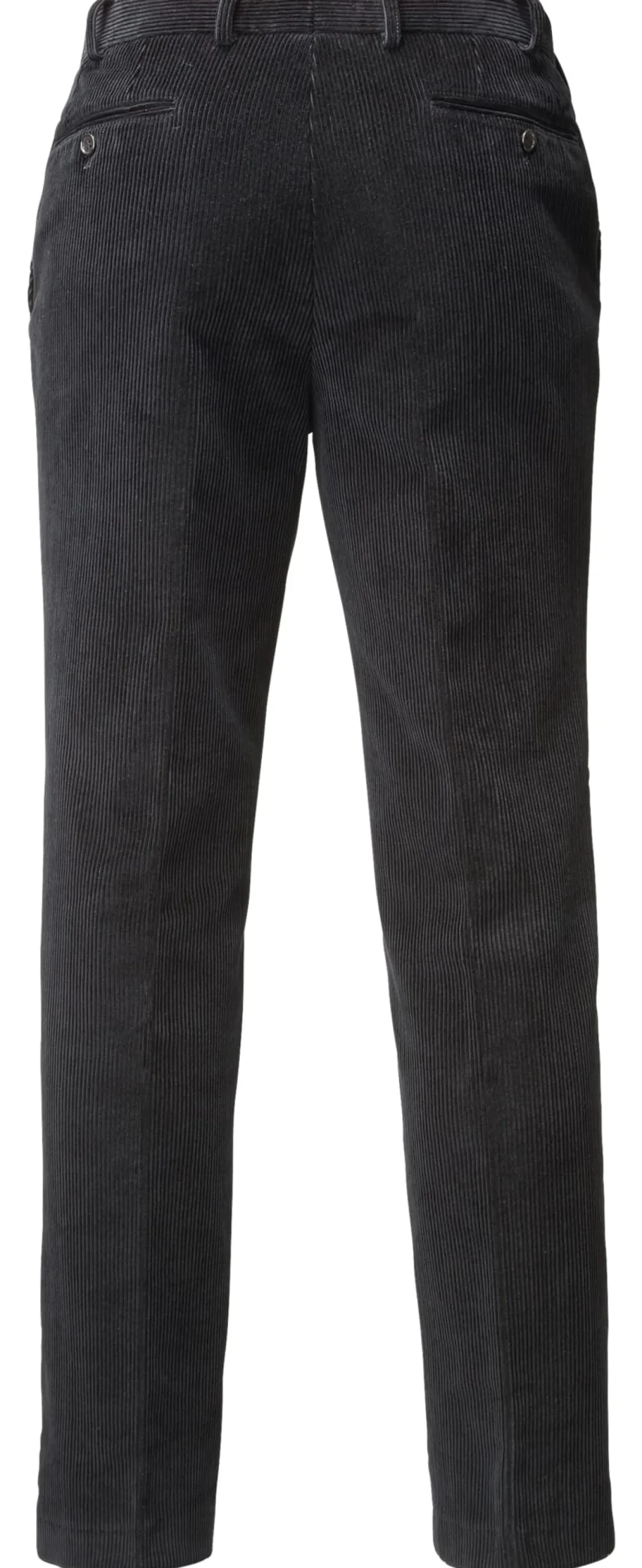 Aus diesem Cord wird üblicherweise Berufsbekleidung gefertigt – extremer Beanspruchung hält das unanfällige Material bestens stand. In der Kette kommt ein kräftiger Zwirn zum Einsatz; im Zusammenspiel mit der hohen Schussfadendichte – 55 Fäden pro Zentimeter – entsteht ein schwergewichtiges, sehr belastbares Gewebe (500 g/qm) von hoher Florfestigkeit. Diese ergibt sich zum einen aus der Art der Verankerung des Florfadens im Gewebe – aus der sogenannten VW-Bindung – und zum anderen aus der großen Anzahl Schussfäden. Herrenhosenspezialist Hiltl lässt daraus in Rumänien diese mäßig weite Herrenhose ohne Bundfalte und Aufschlag konfektionieren. Der seitliche Dehnbund ist mit Oberstoff gedoppelt. Die Hose ist mit französischen Seitentaschen und zwei paspelierten Gesäßtaschen mit Echthornknöpfen ausgestattet.