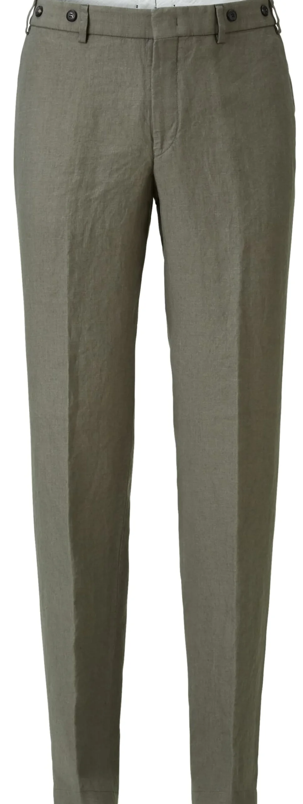 Aus einem kräftigen, aber dennoch weichen Leinengewebe konfektioniert Hiltl diese ungefütterte Hose. Sie ist ohne Bundfalten, dafür mit einer Bügelfalte gearbeitet. Im Bund ist ein farbiges Futter eingesetzt. Die Hose ist mit zwei Seitentaschen und zwei paspelierten Gesäßtaschen ausgestattet, geschlossen wird sie mittels Reißverschluss und Hakenknopf. Sie ist mit Gürtelschlaufen und Hosenträgerknöpfen gearbeitet. Eine Schlaufe aus dem Oberstoff erlaubt es, Kleinteile des täglichen Bedarfs oder eine Kette daran zu befestigen.