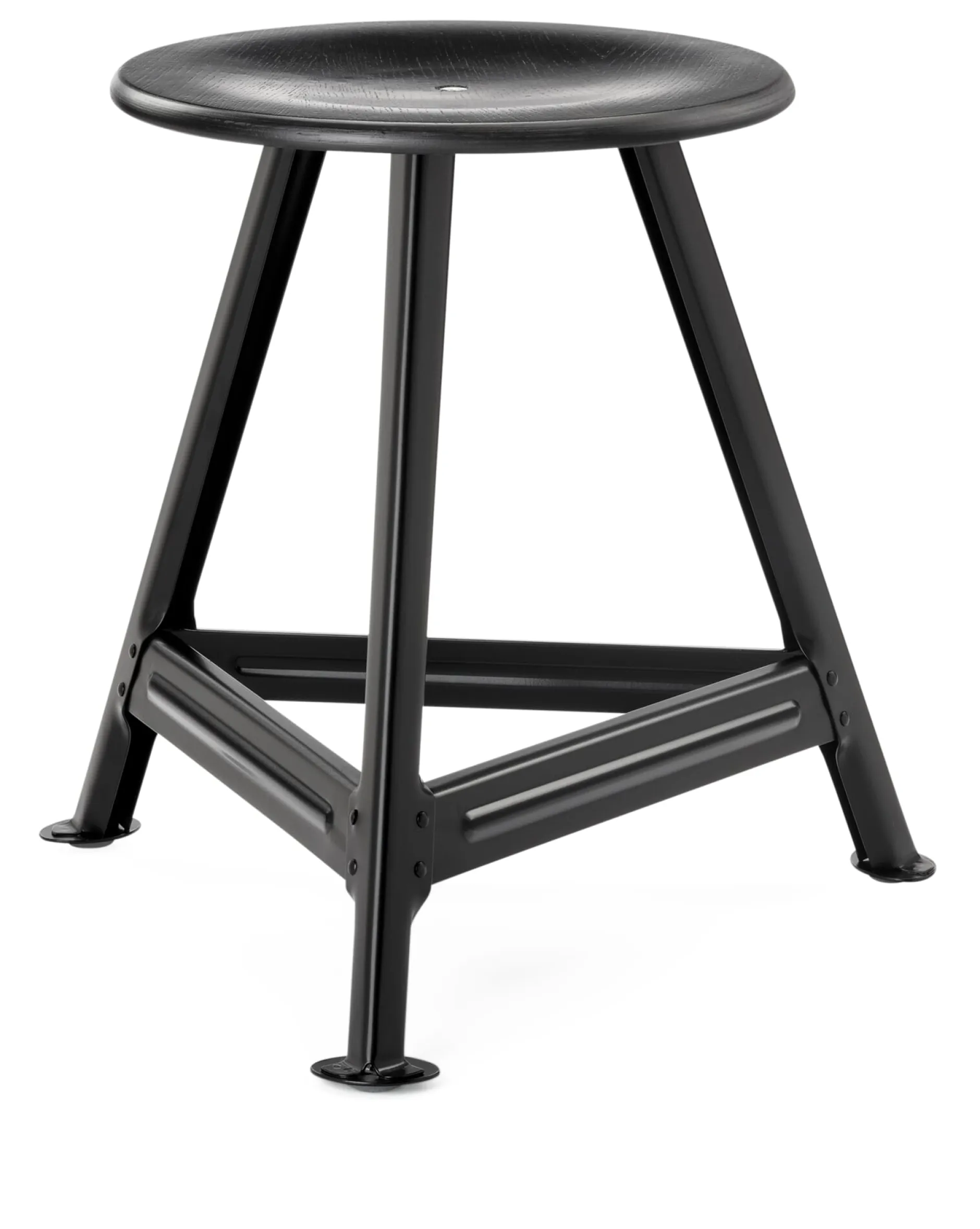 Der Industrie-Arbeitshocker schlechthin: Die Konstruktion dieses Sitzmöbels existiert seit den 20er-Jahren des vergangenen Jahrhunderts und gilt auch heute noch als eines der meist genutzten Arbeitsmöbel – zumindest zu Zeiten verbreiteter manufaktureller Fertigung in der Industrieproduktion. Nicht etwa ein nostalgischer Hang lässt uns dieses Möbel wieder ins Programm aufnehmen. Was uns reizt, ist sein Purismus, die klare und unverfälschte Konstruktion. Seit den 1960er-Jahren wird er unverändert und in bester Industriequalität in einer schwäbischen Fabrikation für Arbeitsmöbel produziert. Die Hocker besitzen stabile Gummigleiter an ihren Füßen, der leicht gemuldete Sitz ist mehrschichtig aufgebaut, die sichtbare Schicht besteht aus Eiche und ist naturbelassen. Die schnelle Patinierung – wenn sie nicht gewünscht ist – vermeidet man mit Ölen oder Wachsen der Oberfläche.