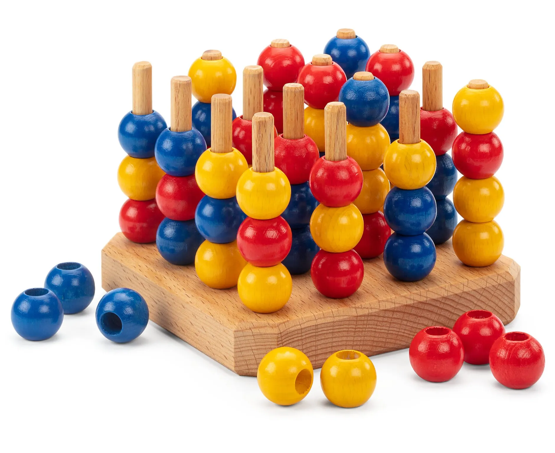 Für 2–3 Spieler*innen. Spielplatte aus Buchenholz geölt, Höhe 10 cm, Breite 12 cm, Tiefe 12 cm. Je 32 rot bzw. blau lackierte Spielsteine sowie 21 gelb lackierte Spielsteine aus Buchenholz. Gesamtgewicht 600 g. Hergestellt in Deutschland.