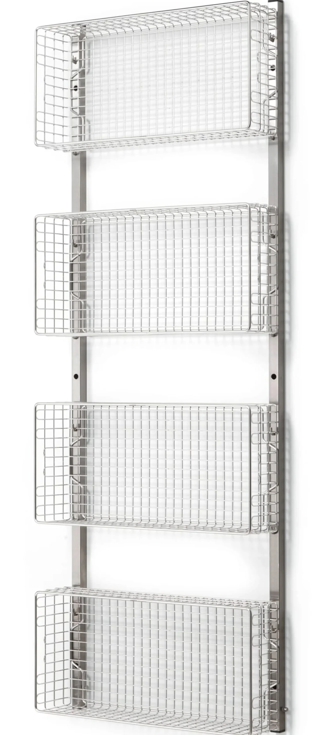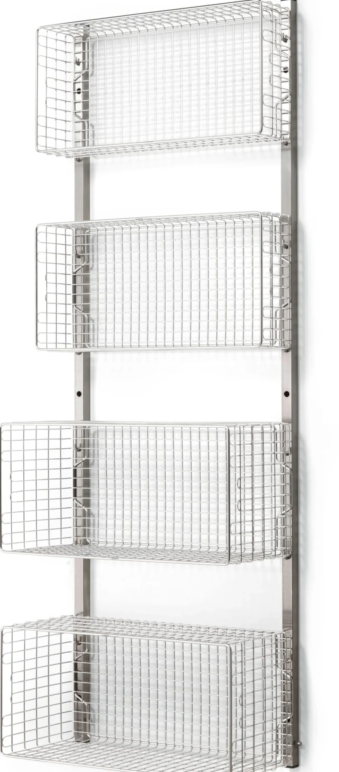Das Regalsystem INOX wurde als Stauraumsystem für Sterilgut und Sterilkleidung entwickelt und hängt als solches in Laboren und anderen sterilen Räumen. Diese zum System gehörenden Gitterkörbe bieten viel Platz für allerlei Staugut und werden werkzeugfrei in die zugehörigen Wandschienen eingehängt. Ob Handtücher im Badezimmer, Geschirr in der Küche oder Schals und Fahrradhelme in der Garderobe: In den Gitterkörben findet alles einen gut durchlüfteten und einsehbaren Platz. Die Körbe sind aus hochwertigem, elektrolytisch polierten Edelstahl-Rundmaterial aus dem Medizinalbereich gefertigt, nahezu unkaputtbar und leicht zu reinigen. Der stirnseitige Tragegriff sorgt für gute Handhabung, die Form des Rahmens macht die Körbe stapelbar.