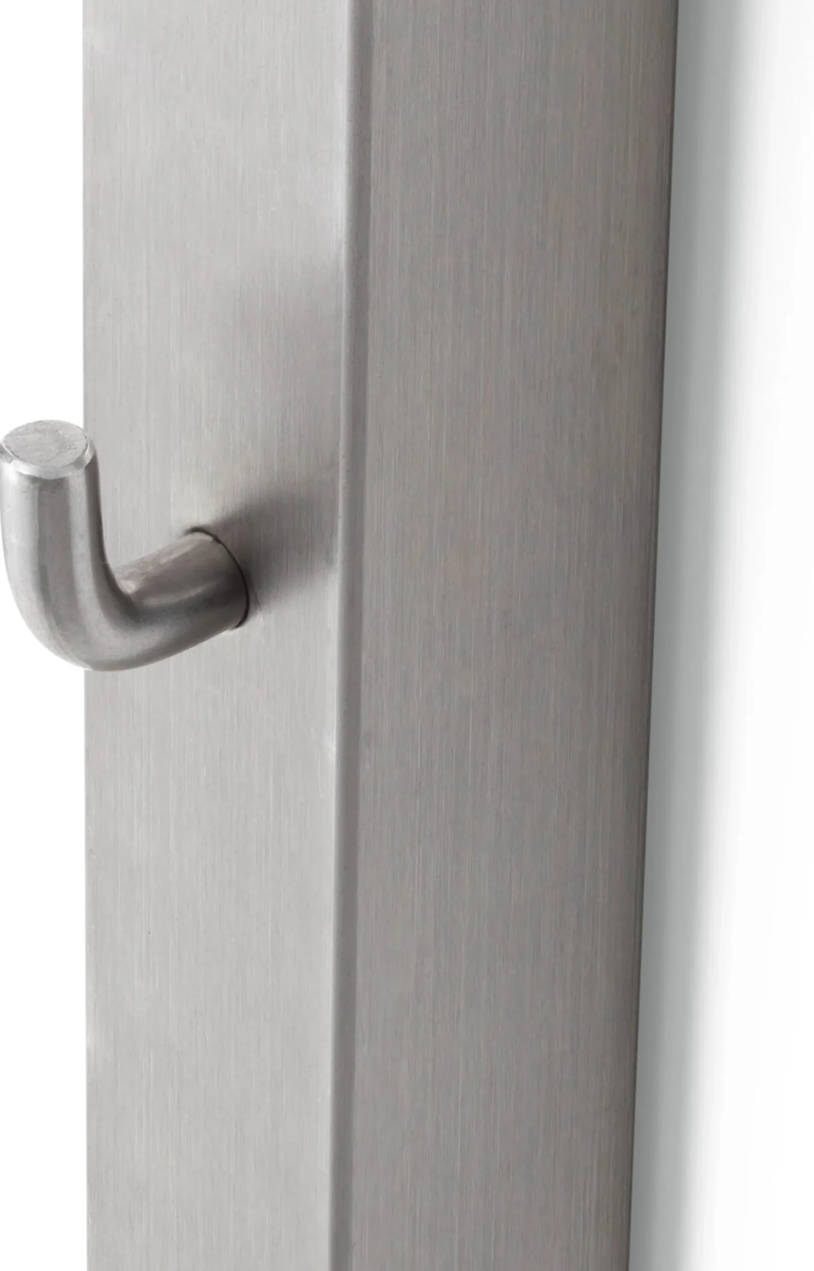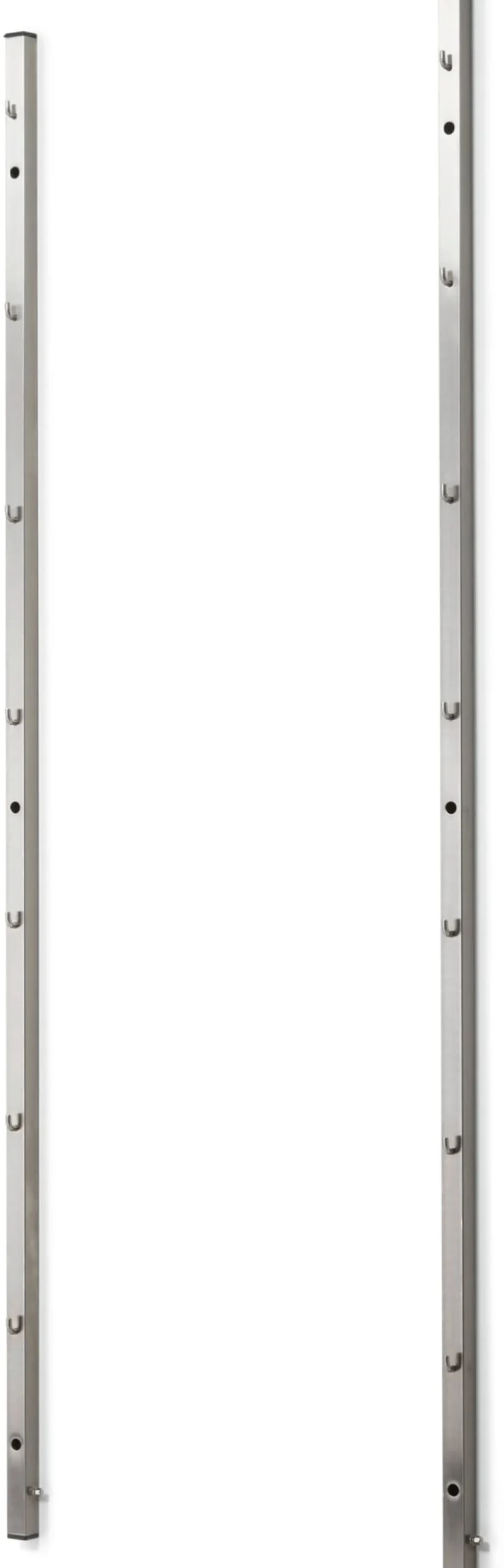 Das Regalsystem INOX wurde als Stauraumsystem für Sterilgut und Sterilkleidung entwickelt und hängt als solches in Laboren und anderen sterilen Räumen. Diese Wandhakenschienen sind das Grundelement zum System. An der Wand montiert, werden die passenden Zubehöre – Gitterkörbe, Hakenleiste, Tischelement und Regalböden – werkzeugfrei in die Haken der Schienen eingehängt. Aus den frei kombinierbaren Elementen entsteht so ein individuelles Staumöbel für Wohnbereich, Küche, Bad oder Schlafzimmer. Die Schienen bestehen aus Vierkantrohren aus hochwertigem Spezialstahl aus dem Medizinalbereich und können oben und unten mit den im Lieferumfang enthaltenen Kunststoffstopfen verschlossen werden. Die Haken sind präzise in das Vierkantrohr eingesetzt und von hinten, also nicht sichtbar, fest verschweißt, das gesamte System ist leicht zu reinigen.
