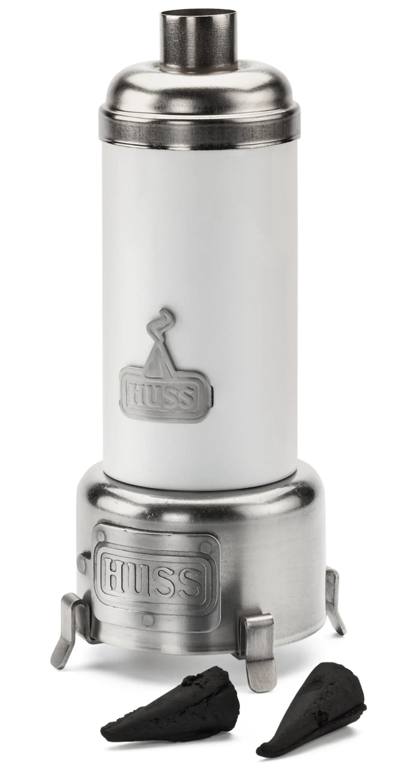 Blech, weiß lackiert. Höhe 13,5 cm, Ø 6,5 cm. Gewicht 150 g. Mit 3 Weihrauch-Räucherkerzen.