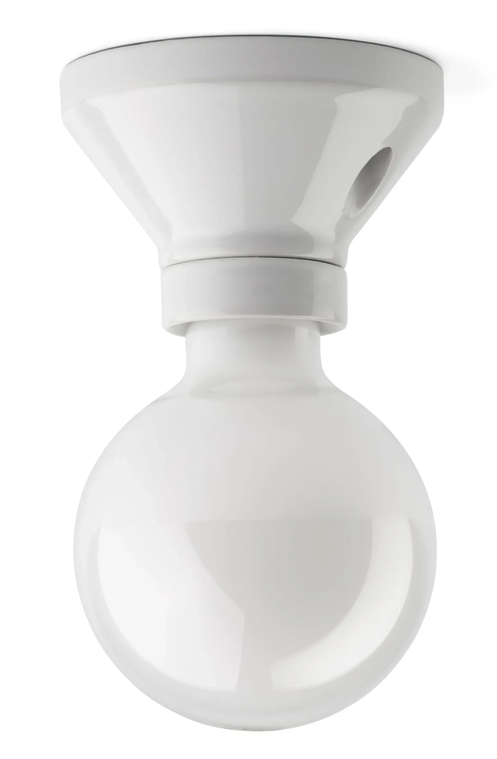 Formschöne E27-Fassung zur Aufnahme von Lampen unterschiedlicher Technik und Lichtstärke. Der konisch verlaufenden Körper aus Porzellan hat sichtbare Öffnungen für die Montageschrauben. Einsetzbar als Wand- oder Deckenleuchte für eine sachliche, aber effektvolle Beleuchtung.