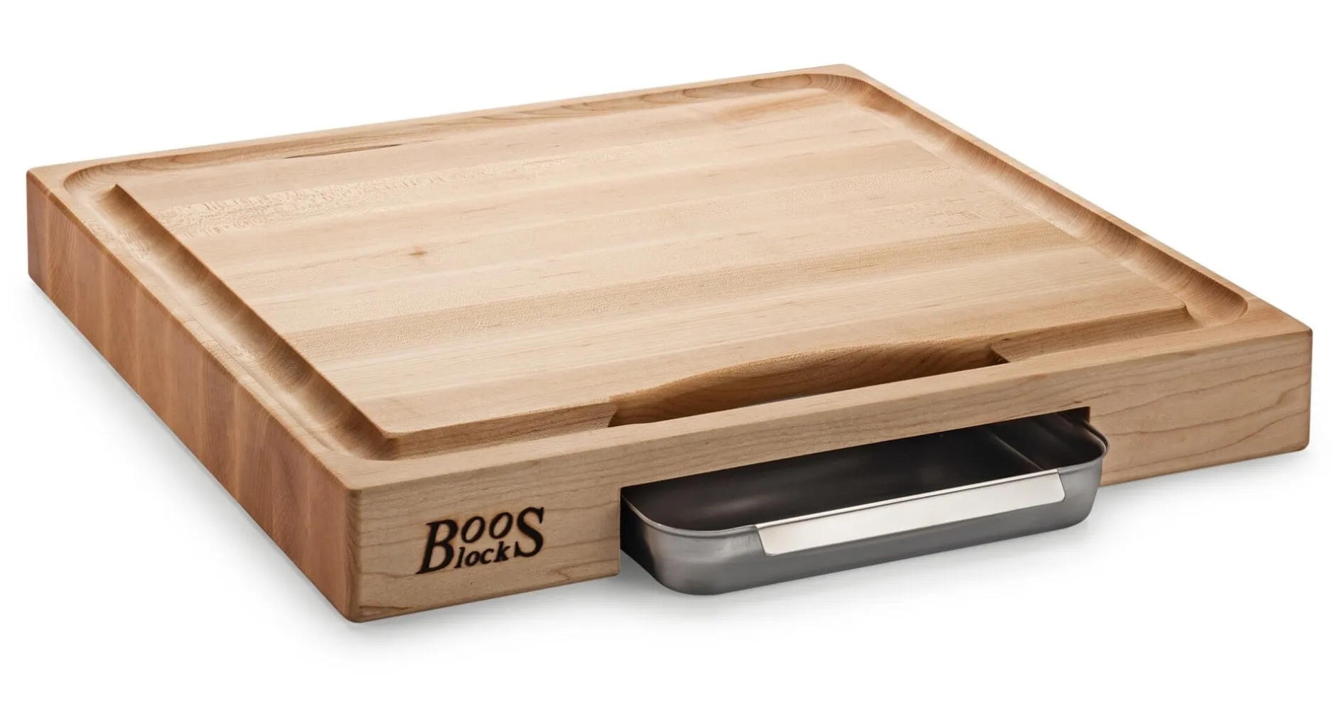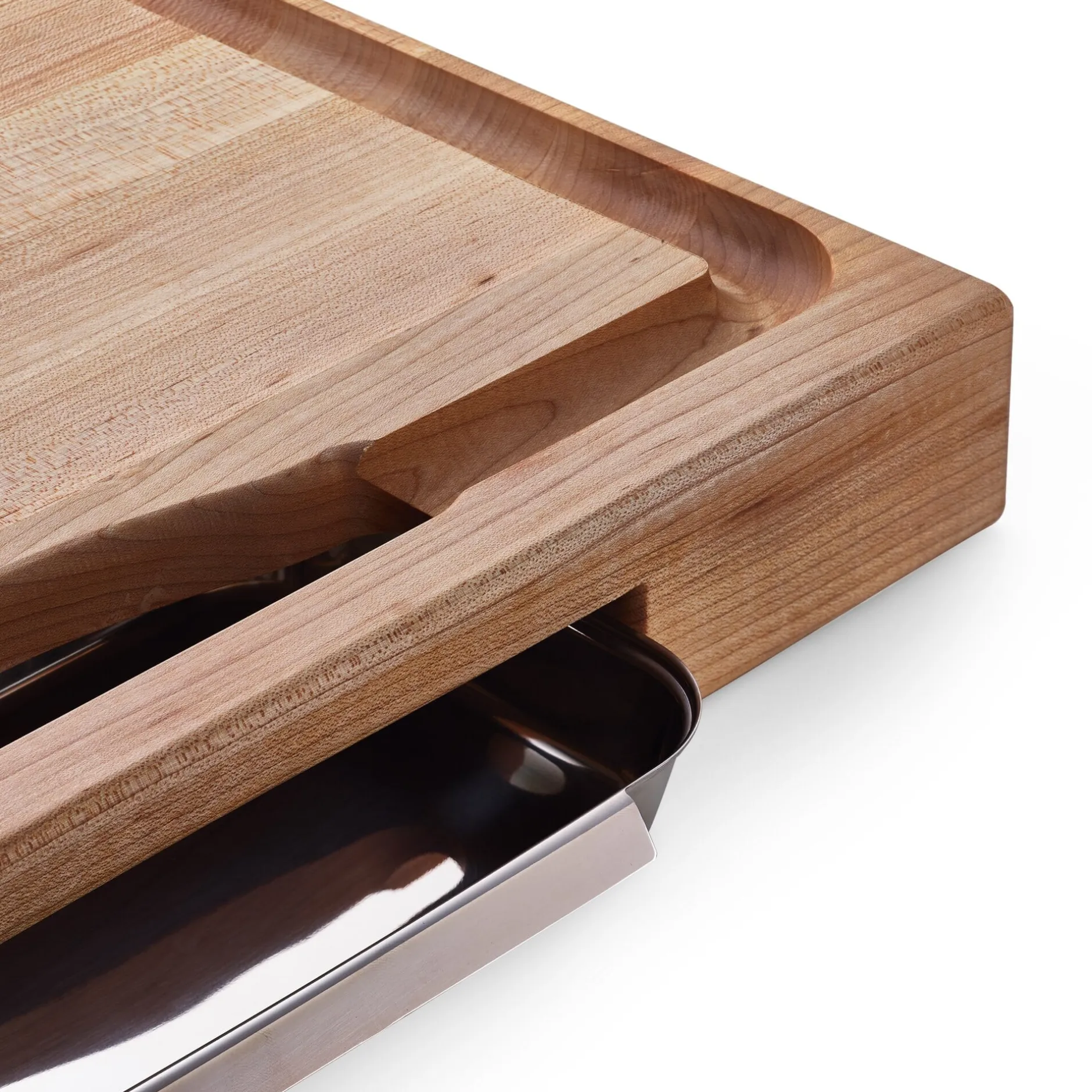 Schneidebretter gibt es viele. In dieser massiven Qualität aus fest verleimtem Ahornholz sind sie allerdings selten. In der Ausführung mit Saftrille und Auffangschale aus Edelstahl produziert der Hersteller in den USA dieses große Brett nur noch für Manufactum.