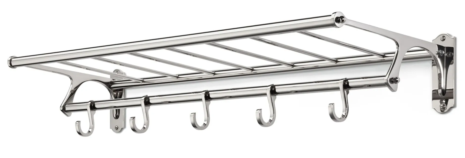 Flurgarderobe mit Grundplatten und Konsolen aus Messing, Stangen aus Messingrohr, Haken aus Messingguss. Oberflächen poliert und vernickelt. Höhe 14 × Breite 81 cm. Ausladung 25 cm. Gewicht 2,6 kg. Lieferung mit Befestigungsmaterial.