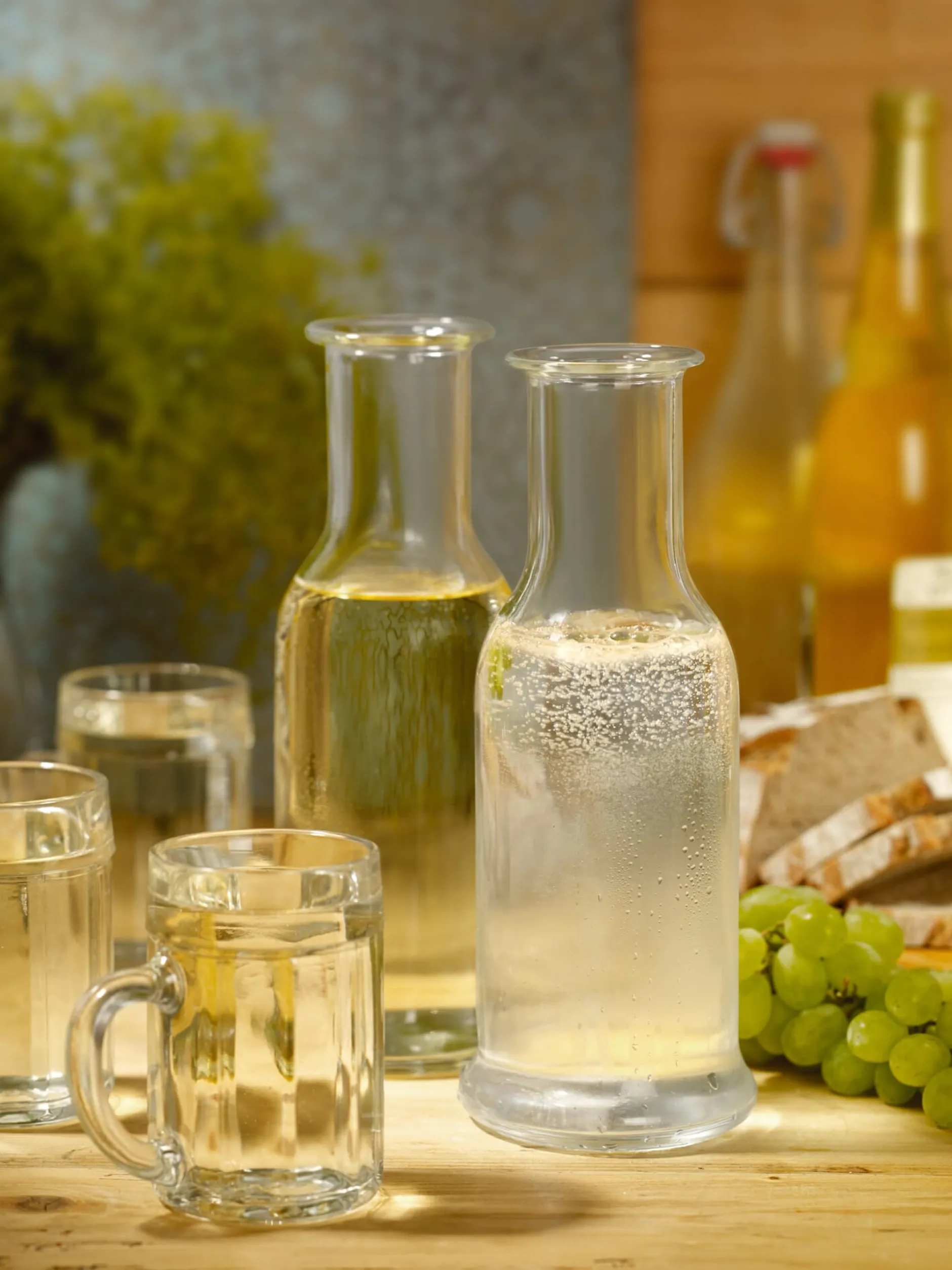 Serie von robusten archetypischen Glaskaraffen. Die an klassische Milchflaschen erinnernde Form lässt sich in all ihren verschiedenen Größen gut und sicher greifen und ausgießen. Dank dickem Boden steht sie standfest und sicher.
