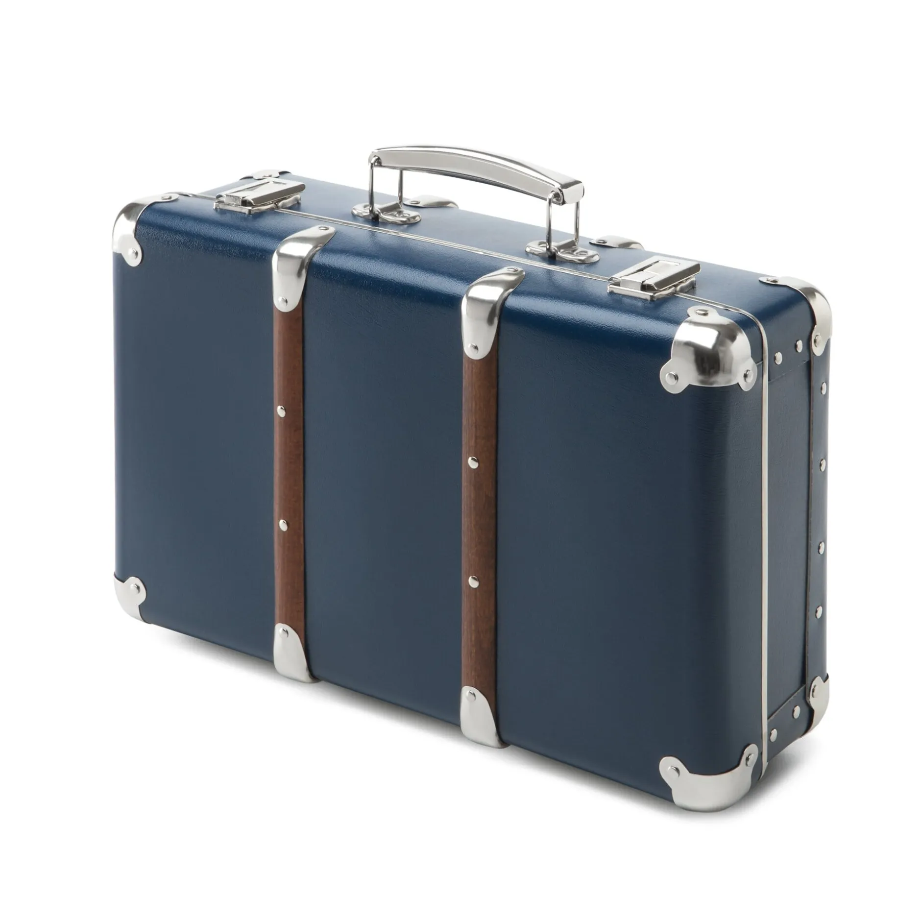 Aus Pappe, mit aus dem Material gebogenen Ecken und Kanten und genieteten Seitenteilen. Ecken und Ränder mit Stahlblech, Deckel und Kofferboden durch aufgesetzte Holzleisten verstärkt. Schloss, Beschläge und Griff ebenfalls Stahlblech. Innenverkleidung aus Papier. Hergestellt in Tschechien.