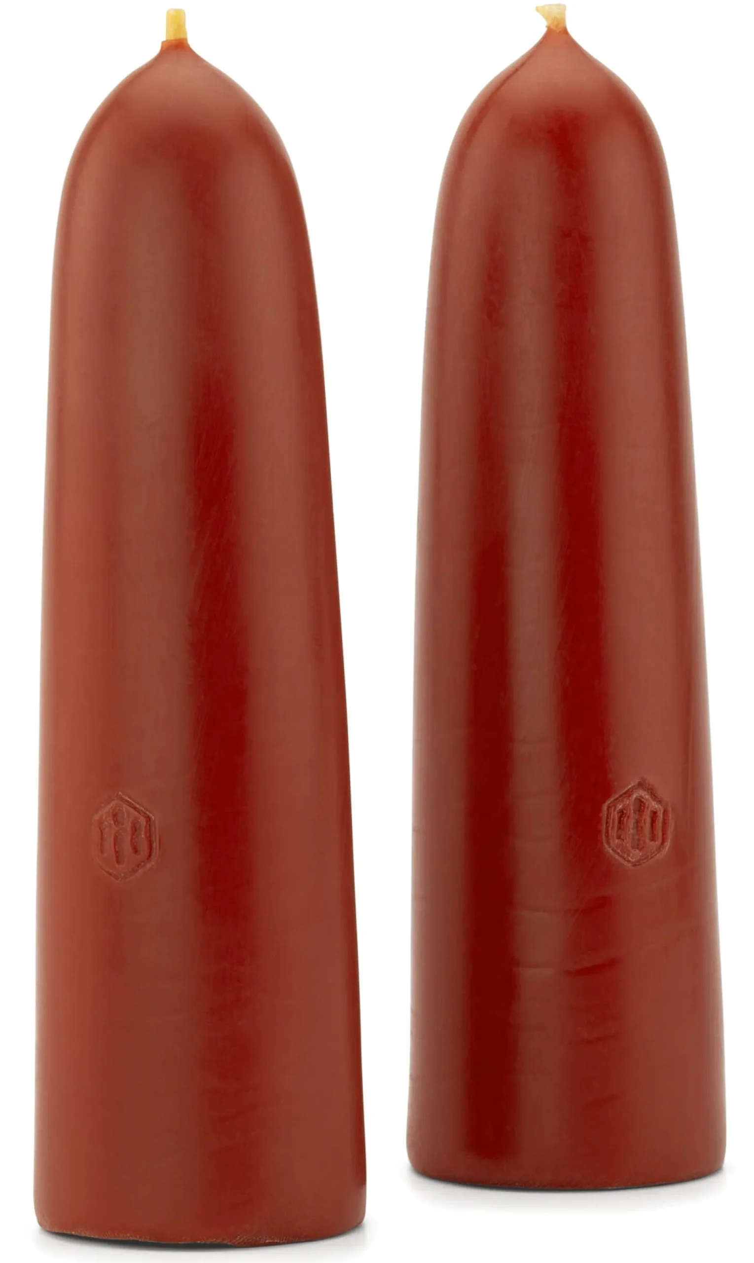 2 Bienenwachskerzen, rot durchgefärbt. Baumwolldocht. Höhe 16 cm, Ø 5 cm. Brenndauer je Kerze ca. 37 Stunden.