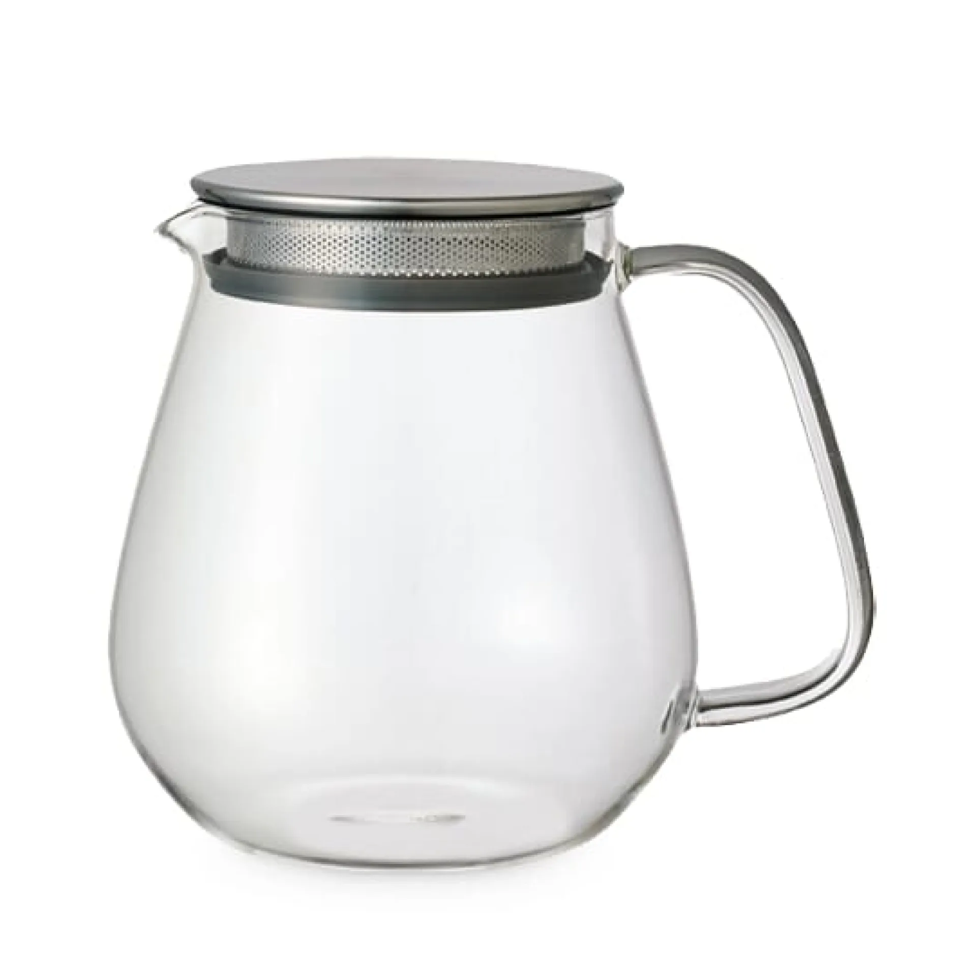 Formschöne Glaskanne, zwei Volumen – UNITEA bietet den Teeblättern in beiden Fällen großes Volumen, sich zu entfalten. Beim Ausgießen hält ein umlaufendes Sieb aus Edelstahl die losen Blätter.
