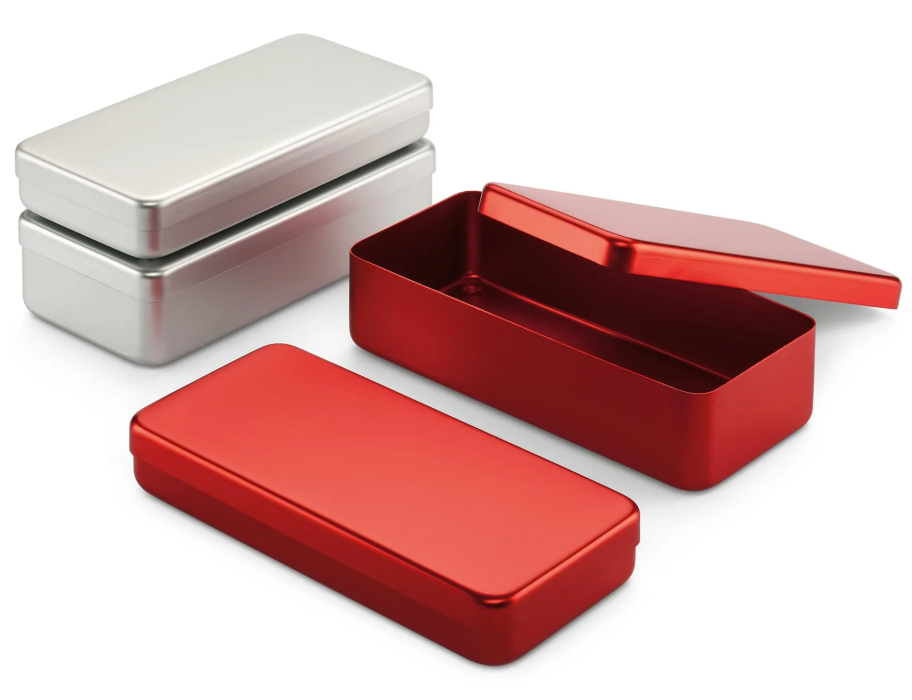 Für die liebsten Zettel, feine Schrauben, bunte Stifte, für Liebgewonnenes und Hochgeschätztes: kleine Kisten aus eloxiertem Aluminium in zwei Farben und zwei Höhenmaßen. Mit passgenauem Stülpdeckel. Nicht für Lebensmittel geeignet.