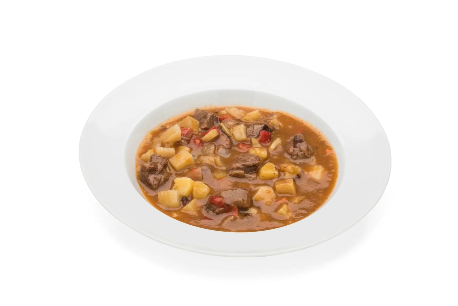 Dieses kräftige Rindergulasch wird mit einem Anteil von 30% Rindfleisch hergestellt. Beim Schmoren kommen dann Zwiebeln, Kartoffeln, Karotten, Paprika, Knoblauch und Tomatenmark hinzu, abgeschmeckt wird mit Rotwein und feinen Gewürzen.