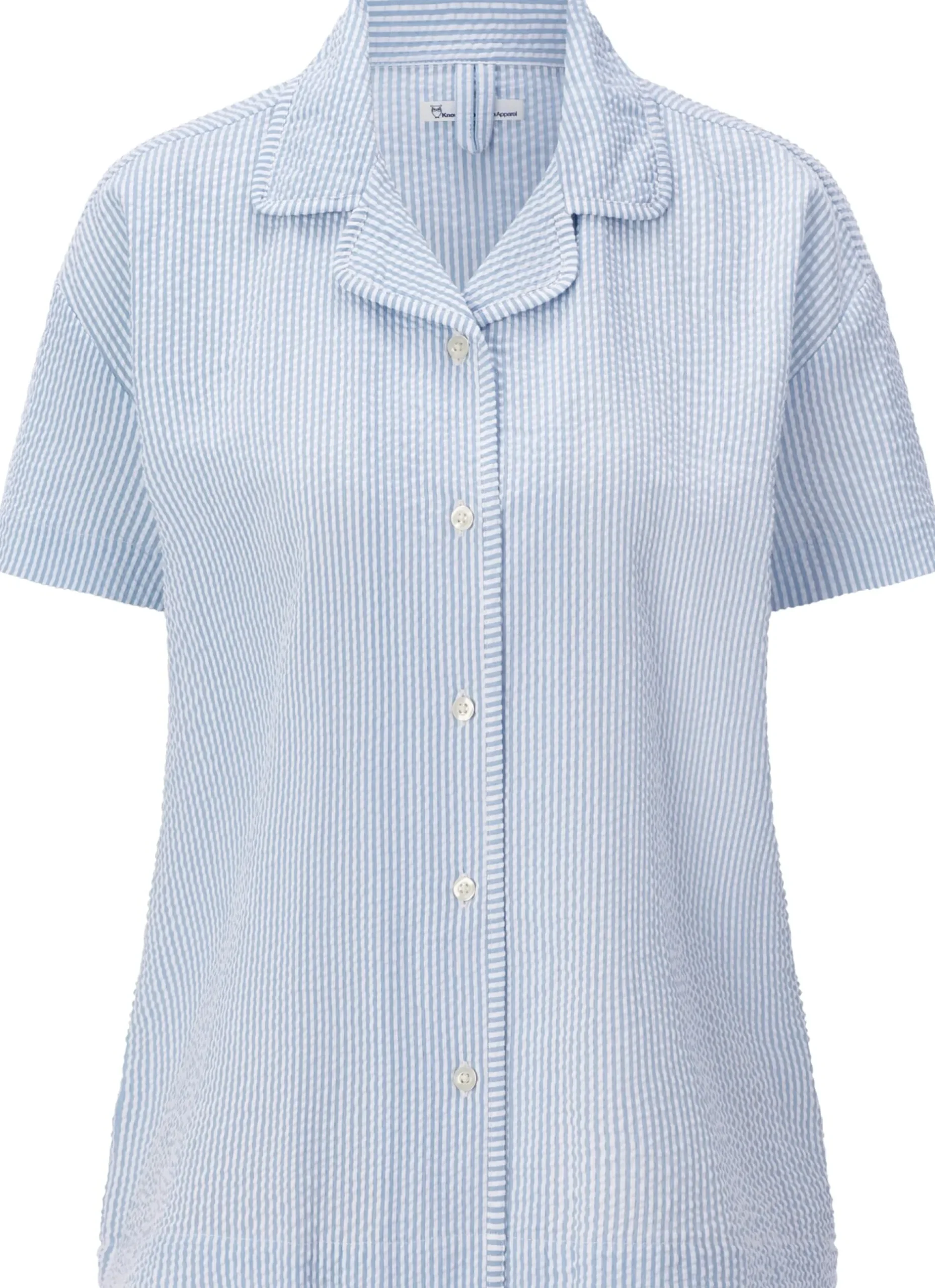 Luftig-leicht ist dieses gestreifte Pyjamashirt, das Knowledge Cotton Apparel aus hautsympathischer, kontrolliert biologisch angebauter Baumwolle fertigt. Das Seersucker-Gewebe ist nicht nur pflegeleicht und strapazierbar, dank seiner gekreppten Oberfläche liegt es nicht vollflächig auf der Haut, wodurch die Luft gut zirkulieren kann. Die lockere Passform erhöht den Tragekomfort noch und sorgt für viel Bewegungsfreiheit. So ist das Shirt ein komfortabler Begleiter für die warme Jahreszeit, ob Sie es nun nachts oder tagsüber tragen, zum Beispiel zu Jeans, Sommerrock oder Shorts.