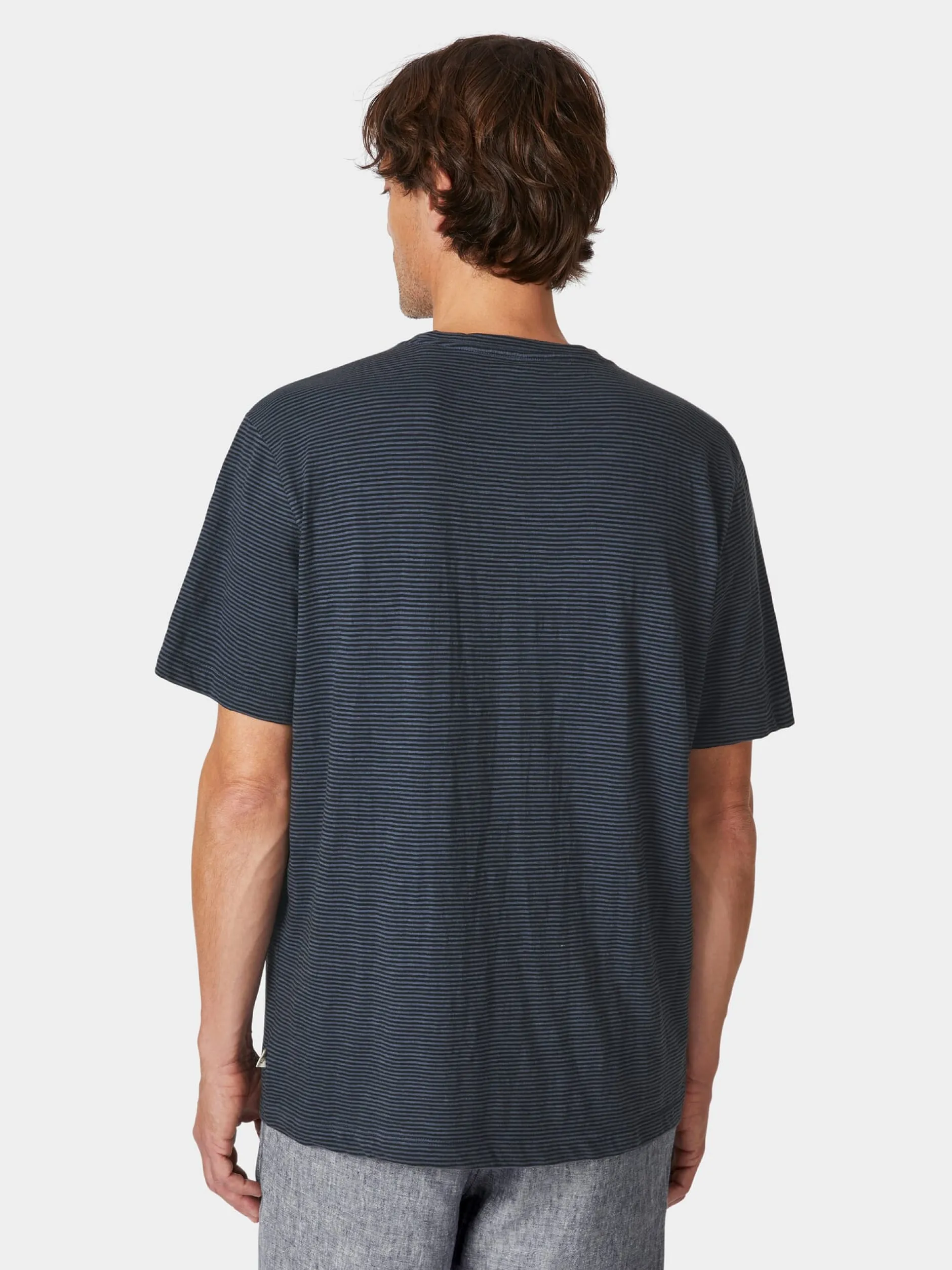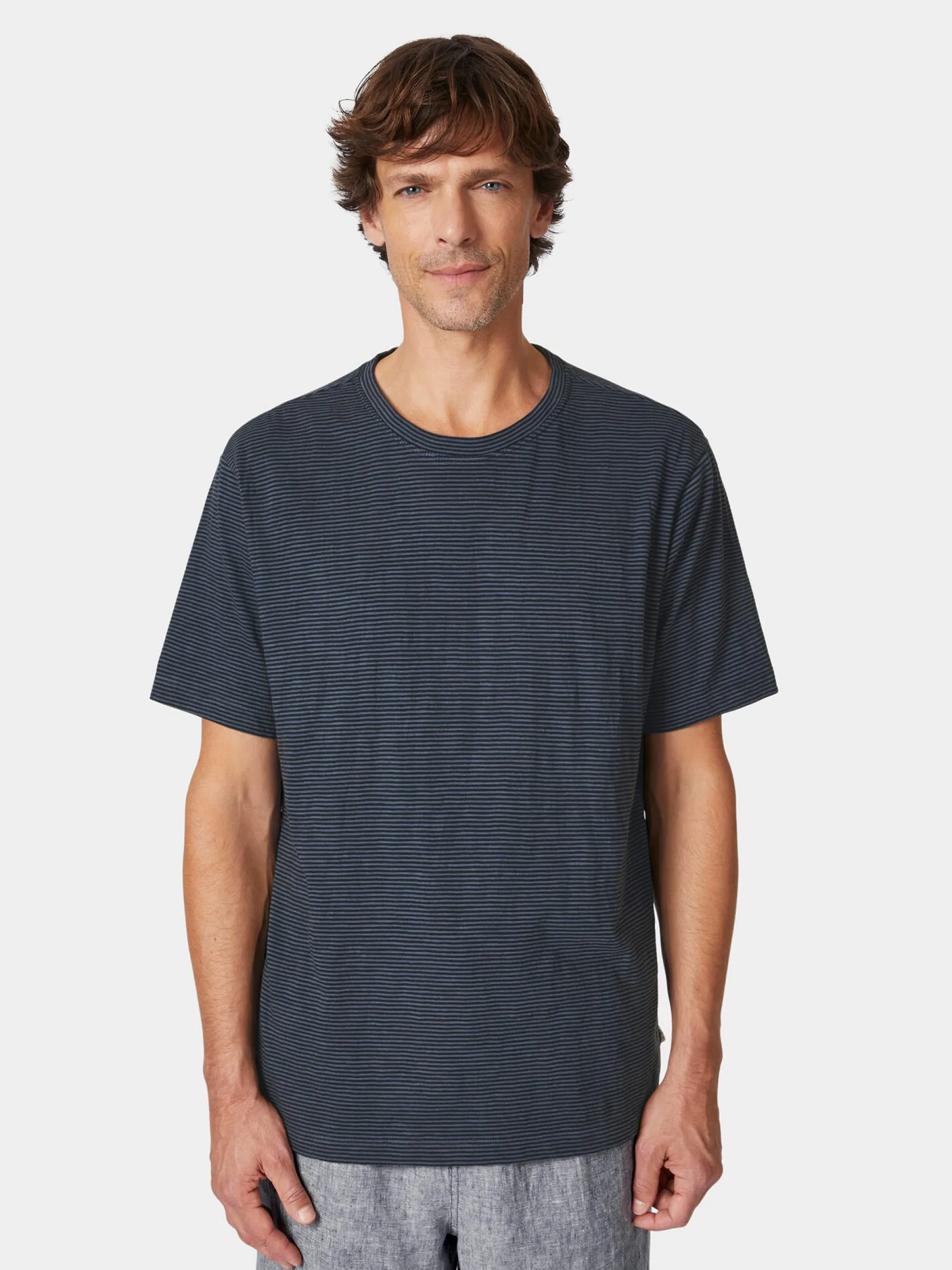 Fein geringeltes T-Shirt aus weichem Single-Jersey, das eine gute Ergänzung der sommerlichen Garderobe darstellt. Die verwendete Baumwolle stammt aus kontrolliert biologischem Anbau.