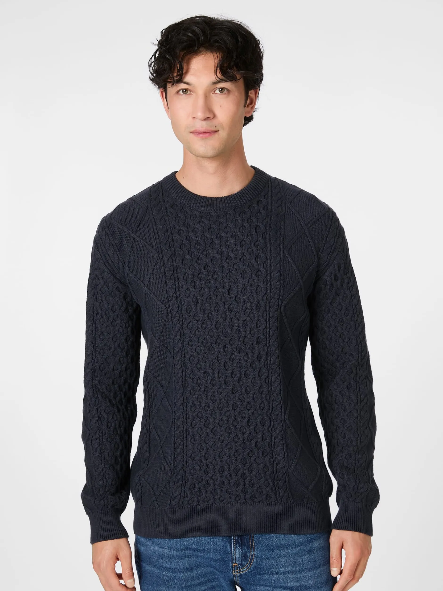 Für das markante Strickbild dieses Pullovers aus kontrolliert biologisch angebauter Baumwolle greift Knowledge Cotton Apparel auf die berühmten Aranmuster zurück, die von den gleichnamigen irischen Inseln stammen und ihren Träger*innen einst symbolhaft gute Wünsche mit auf den Weg gaben. Da sind die klassischen Zopfmuster (auch Cable Knit genannt), die wie gedrehte Stränge aussehen und dem Gestrick Textur und Tiefe geben. Sodann die klassischen Rauten- oder Diamantmuster, die hier von den Schultern abwärts und auf den Außenseiten der Ärmel verlaufen. Und schließlich noch das Honeycomb-Muster auf Brust, Rücken und Ärmeln, das mit seiner charakteristischen Struktur an Bienenwaben erinnert. Breite Rippenstrickbündchen bilden den Abschluss an Hals, Ärmeln und Rumpf.