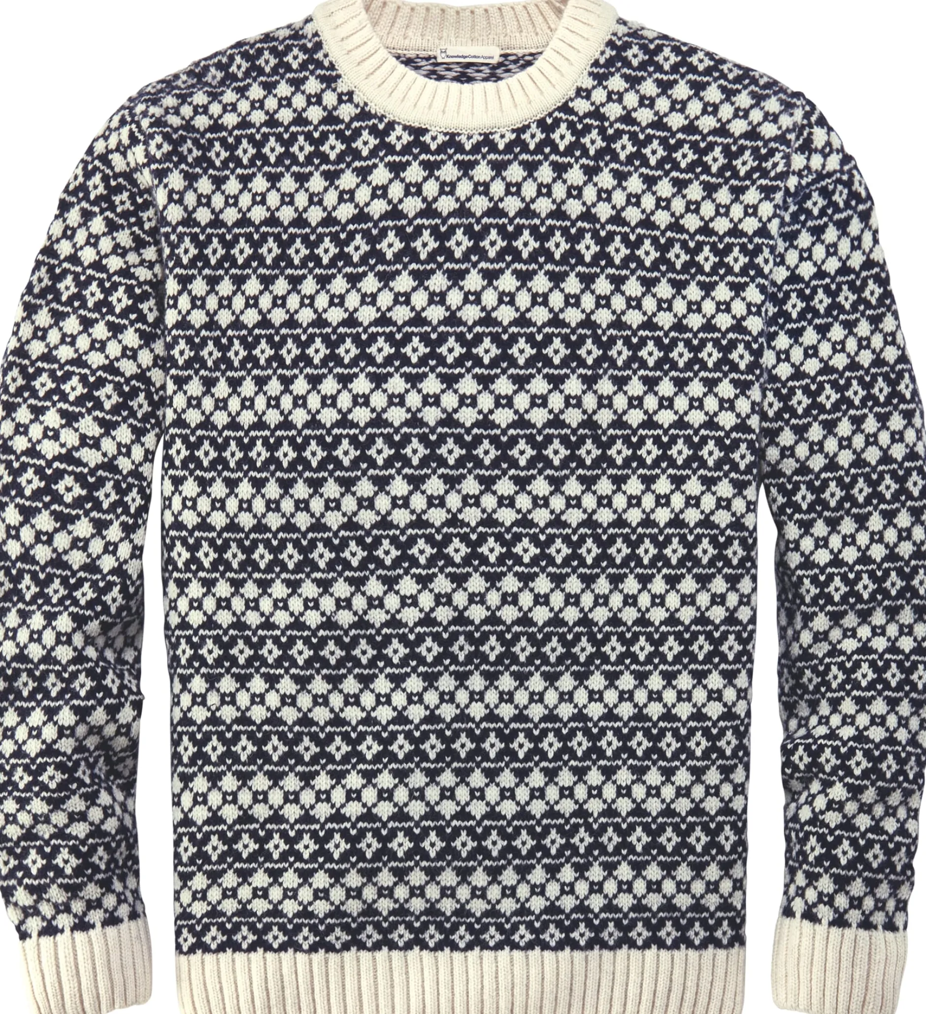 Dieser glattgestrickte Pullovers zeigt ein markantes, komplexes Muster aus geometrischen Formen, das den berühmten Fair-Isle-Mustern nicht unähnlich ist. Im Griff ist der Pullover wärmend und hautsympathisch, da Knowledge Cotton Apparel hier auf weiche Lammwolle aus kontrolliert biologischer Tierhaltung zurückgreift. Kontrastierende breite Rippenstrickbündchen bilden den Abschluss an Hals, Ärmeln und Rumpf.