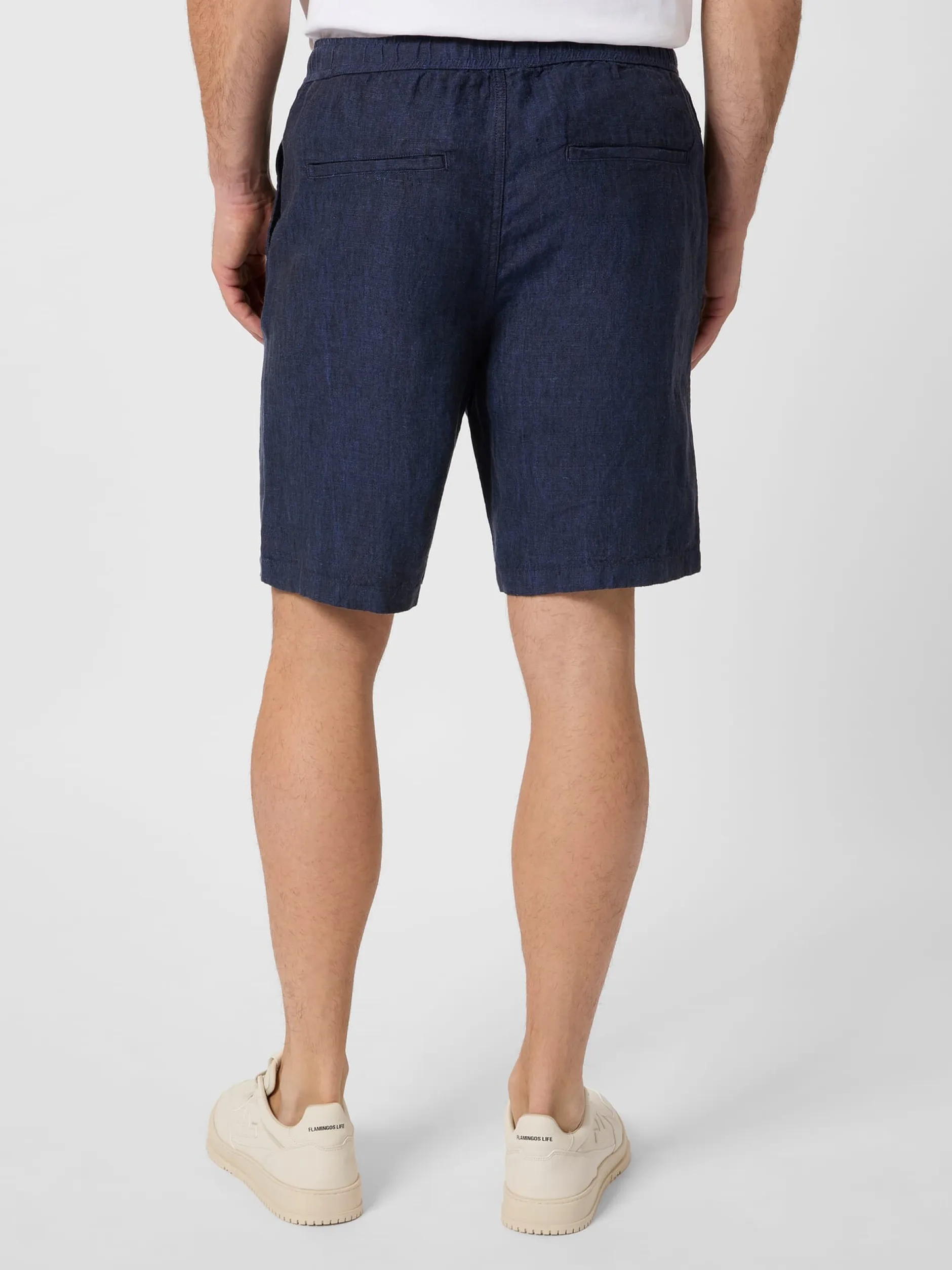 Lässige Shorts, deren Stoff aus strapazierbarem, kühlendem Leinen besteht. Das Gewebe zeigt die materialtypischem Fadenverdickungen und einen ausgeprägten Melangeeffekt. Die Shorts wird wird mittels Reißverschluss und Knopf geschlossen, ein Gummibund mit Bindeband im Tunnelzug erhöht den Tragekomfort. Je zwei Seitentaschen und eingesetzte Gesäßtaschen nehmen Kleinteile des täglichen Bedarfs auf. Die Flachsfasern für den Stoff stammen aus kontrolliert biologischem Anbau.